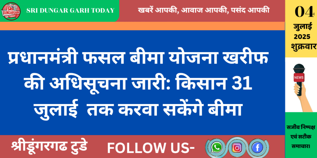 राज्य सरकार ने खरीफ-2025 के लिए फसल बीमा की अधिसूचना जारी कर दी है। संयुक्त निदेशक कृषि (विस्तार) कैलाश चौधरी ने बताया कि जिले के लिए एग्रीकल्चर इंश्योरेंस कंपनी ऑफ इंडिया अधिसूचित की गई है। उन्होंने बताया कि ऋणी किसान 31 जुलाई तक अपनी फसलों का बैंक के माध्यम से बीमा करवा सकते हैं। ऐसे ऋणी कृषक जो अपनी फसलों का बीमा नहीं करवाना चाहते, वे बैंक में ऑफ डाउट फॉर्म भरकर 24 जुलाई तक जमा करवा सकते हैं। उन्होंने बताया कि इच्छुक किसान जो अपनी फसलों में परिवर्तन करना चाहते हैं। वे 29 जुलाई तक बैंक में लिखित पत्र दे सकते हैं।