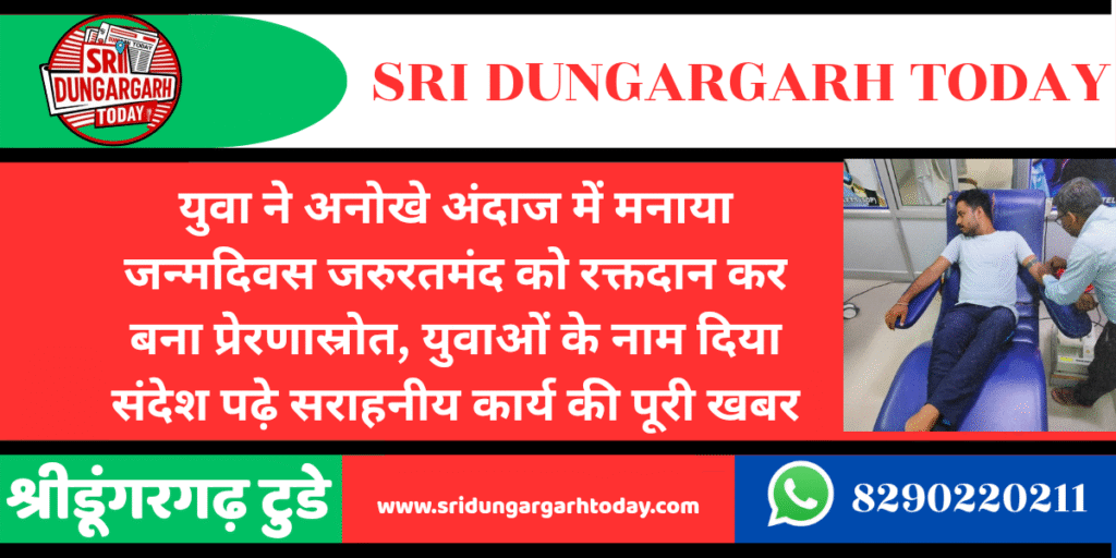 सुखराम जाखड़ , उम्र 28 निवासी गांव धर्मास ने आज अपने जन्मदिन के अवसर पर रक्तदान कर समाज के सामने एक मिसाल पेश की। यह उनका पहला रक्तदान नहीं था, लेकिन इसे उन्होंने “किसी को जिंदगी देने का दिन” कहा। युवा सुखराम जाखड़ ने भावुक होते हुए कहा कि “मैं चाहता था कि मेरे जन्मदिन पर किसी को खुश मिली, और वह जरूरमन्द हो जिसे मेरे खून की जरूरत हो। इस दिन को में सेल्फी और केक तक सीमित नहीं रखना चाहता था,” युवा ने बताया कि रक्तदान कोठारी हॉस्पिटल बीकानेर में किया गया, जहाँ जनदिवस के दिन दिन पहले से ही एक जरूरतमंद मरीज को O+ ब्लड की सख्त आवश्यकता थी। हनुमान राम ओझा आड़सर बास श्री डूंगरगढ़ के समय पर किए गए रक्तदान ने उस मरीज की जान बचाने में अहम भूमिका निभाई।