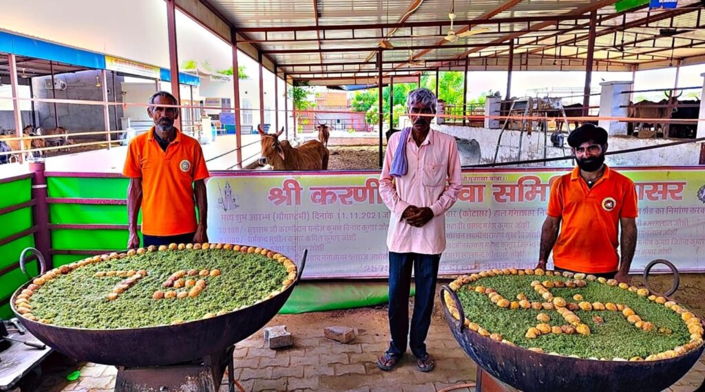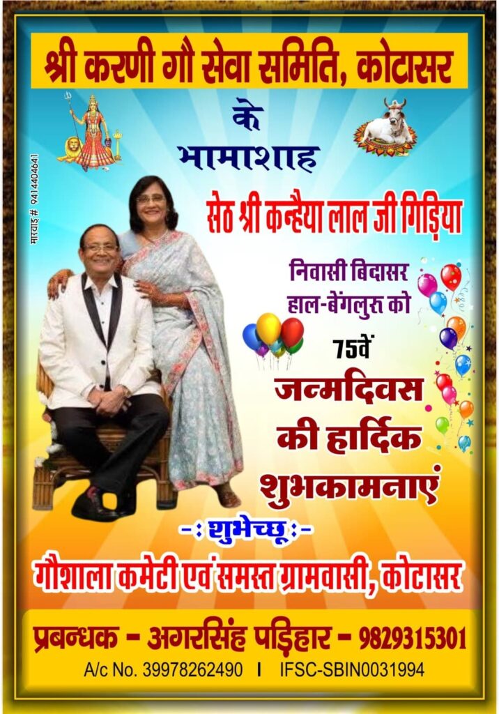 श्री करणी गो सेवा समिति गौशाला कोटासर के भामाशाह समाजसेवी गौसेवी धर्मानुरागी कन्हैयालाल गिड़िया निवासी बिदासर प्रवासी बेंगलुरु को 75 वें जन्म दिवस पर गौशाला कमेटी ने बधाइयां देते हुए दीर्घायु की कामना की भामाशाह ने जन्मदिवस पर 5100रू की पावन राशि समर्पित कर गौशाला की संपूर्ण गौ माताओं के लिए 2कड़ाई गुड़ मिश्रित मूंग चूरी का अति पावन विशाल भंडारा समर्पित जन्मदिवस मनाया अगरसिंह ने बताया कि गौशाला में पहली बार अपने गत जन्मदिवस पर विशाल भंडारा गौ माताओं को समर्पित कर जुड़े हैं गौशाला कमेटी ने भामाशाह के लिए सदैव मंगल कामना की आप सदैव स्वस्थ रहें।