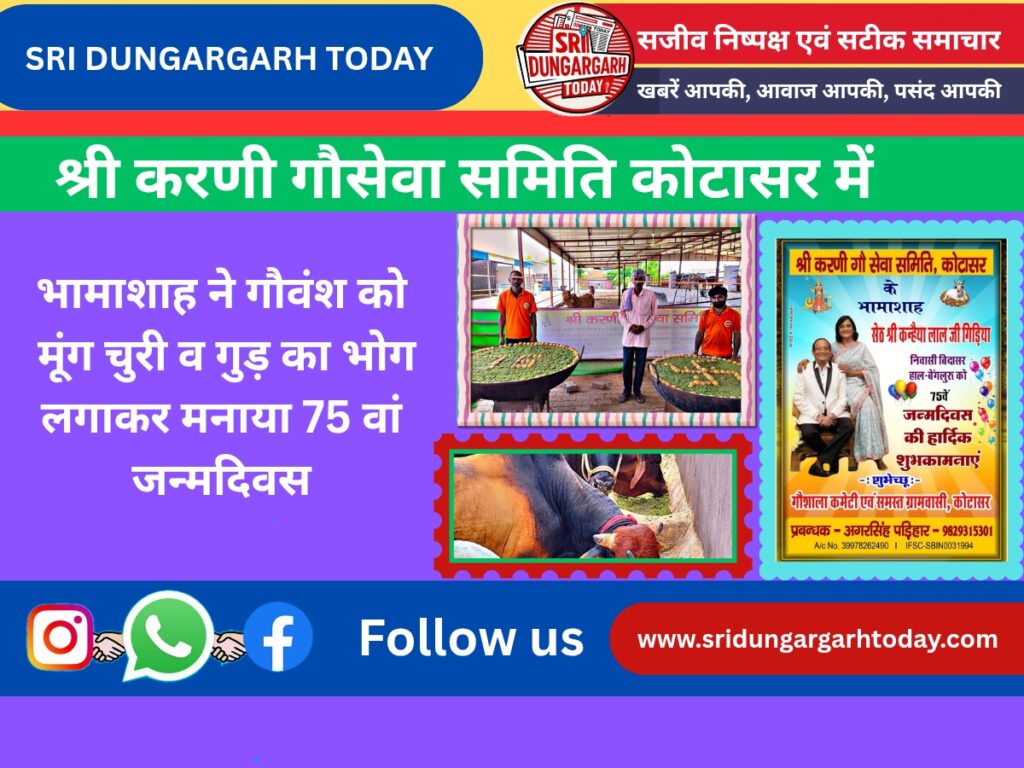श्री करणी गो सेवा समिति गौशाला कोटासर के भामाशाह समाजसेवी गौसेवी धर्मानुरागी कन्हैयालाल गिड़िया निवासी बिदासर प्रवासी बेंगलुरु को 75 वें जन्म दिवस पर गौशाला कमेटी ने बधाइयां देते हुए दीर्घायु की कामना की भामाशाह ने जन्मदिवस पर 5100रू की पावन राशि समर्पित कर गौशाला की संपूर्ण गौ माताओं के लिए 2कड़ाई गुड़ मिश्रित मूंग चूरी का अति पावन विशाल भंडारा समर्पित जन्मदिवस मनाया अगरसिंह ने बताया कि गौशाला में पहली बार अपने गत जन्मदिवस पर विशाल भंडारा गौ माताओं को समर्पित कर जुड़े हैं गौशाला कमेटी ने भामाशाह के लिए सदैव मंगल कामना की आप सदैव स्वस्थ रहें।
