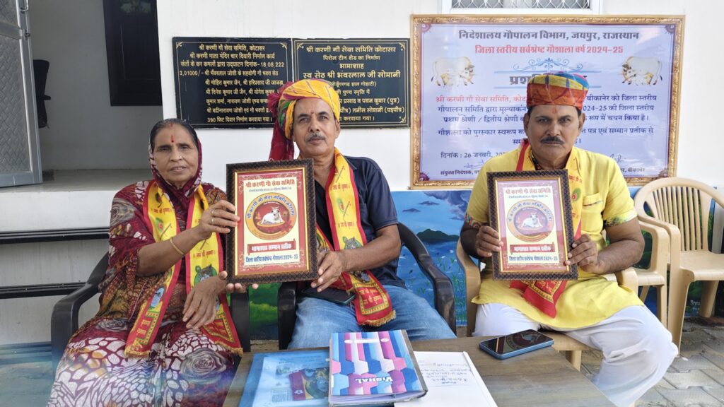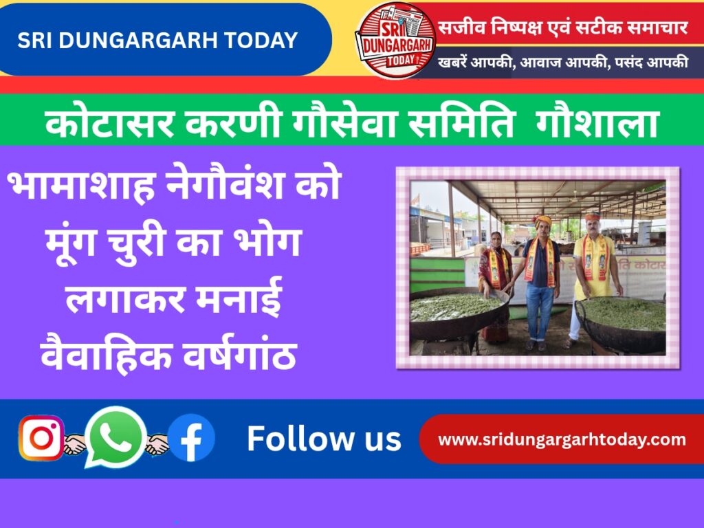 दुलचासर के आशाराम मूंधड़ा के सुपुत्र अखेचंद अपनी धर्मपत्नी श्रीमती संतोष देवी एवं शिव शंकर मूंधड़ा दुलचासर ने आज गौशाला में पधारकर आज शिव शंकर मूंधड़ा संग श्रीमती सुमित्रा देवी मूंधड़ा दुलचासर की 37वीं वैवाहिक वर्षगांठ के अवसर पर दो कड़ाई मूंग चूरी का अति पावन भंडारा गौ माताओं को समर्पित कर वैवाहिक वर्षगांठ मनाई गौशाला कमेटी ने दोनों को वैवाहिक वर्षगांठ की ढेर सारी बधाइयां देते हुए खुशहाल दांपत्य जीवन के लिए मंगल प्रार्थना की केमटी ने मूंधड़ा परिवार का आभार व्यक्त किया की भामाशाह ने शुभ कार्यों में गौ सेवा कर रहे हैं केमटी ने बताया कि भामशाह की बहन ने वीडियो कॉल माध्यम के अनुसार गौशाला की सेवा देखकर ₹1100 की पावन राशि समर्पित की है ।गौशाला कमेटी परिवार के लिए सुख समृद्धि की कामना की।