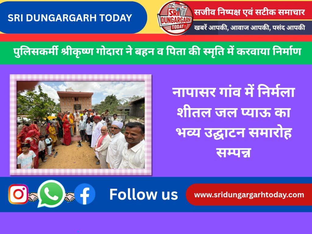 आज नापासर एक गांव में निर्मला शीतल जल प्याऊ का भव्य उद्घाटन समारोह सम्पन्न और जनकल्याणकारी पहल के तहत “निर्मला शीतल जल प्याऊ” का भव्य उद्घाटन समारोह सम्पन्न हुआ। यह प्याऊ राजस्थान पुलिस में सेवारत श्री कृष्ण गोदारा द्वारा अपने पूज्य पिताजी व दिवंगत बहन की स्मृति में स्थापित कराया गया है।इस प्याऊ का उद्घाटन राजस्थान सरकार के मंत्री सुमित जी गोदारा की धर्मपत्नी श्रीमती शांता चौधरी एवम बीकानेर जिला कांग्रेस देहात के अध्यक्ष बिशनाराम सियाग द्वारा किया गया l सियाग ने बताया यह प्याऊ केवल एक जलस्थल नहीं, बल्कि सेवा, श्रद्धा और संस्कारों का प्रतीक है। गांववासियों को गर्मी में शीतल जल उपलब्ध कराना एक महान पुण्य है और कृष्ण ने यह साबित कर दिया है कि समाज के लिए कुछ कर दिखाने की भावना हो तो कोई भी बाधा आड़े नहीं आती।