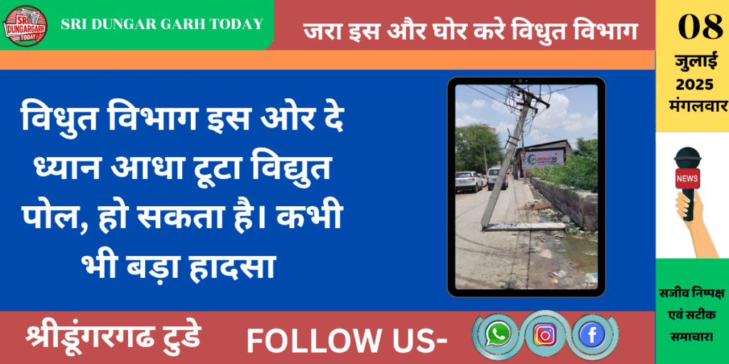 कस्बें के मोमासर बास वार्ड नं. 4 स्थित श्मशान भूमि के पास एक विद्युत पोल टूटकर आधा सड़क पर झुक गया है। और पोल अब भी विद्युत सप्लाई चालू है।, जिससे किसी भी समय बड़ी दुर्घटना की आशंका बनी हुई है।गोभक्त आनंद जोशी ने बताया की दो दिनों से पोल टूटकर आधा झुका हुआ है। तार काफी नीचे झूल रहे हैं और टूटे हुए पोल का संतुलन इन्हीं तारों पर टिका हुआ है। और ऐसे में यह न केवल राहगीरों के लिए खतरनाक है बल्कि स्थानीय निवासियों और गुजरने वाले वाहनों के लिए भी जोखिम भरी है। स्थानीय लोगों ने विद्युत विभाग से तुरंत कार्रवाई की मांग की है ताकि समय रहते पोल को ठीक किया जाए ताकि कोई बड़ी अनहोनी होने से बच जाए