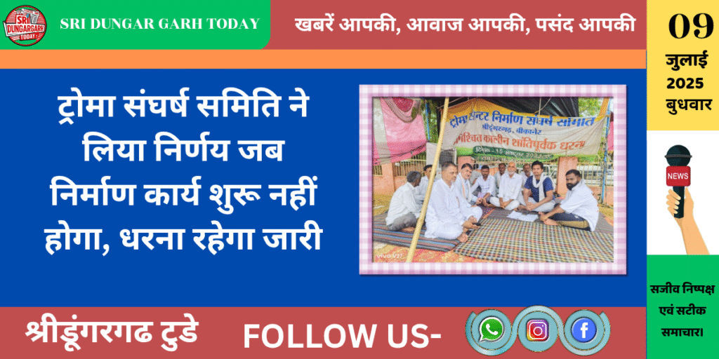 संघर्ष समिति के मदनलाल प्रजापत, राजेंद्र प्रसाद स्वामी, रामकिशन गावड़िया, प्रकाश गाँधी ने कहा की कल मुख्यमंत्री ने श्रीडूंगरगढ़ मे आम सभा दौरान कहा था की ट्रॉमा सेंटर हम बनाएंगे, जमीन भी देंगे, और पैसे भी हम देंगे परन्तु ये एक जुमला है,लेकिन ऐसी घोषणाएं पहले भी कई बार हुई हैं। हमें अब कागज़ी बातें नहीं, धरातल पर काम चाहिए।” संघर्ष समिति की सर्व सहमति से ये निर्णय लिया है की जब तक पूर्व ने निर्धारित झंवर बस स्टैंड के पास विवादित भूमि पर सरकार द्वारा जब तक ट्रॉमा सेंटर और उप जिला अस्पताल का निर्माण शुरू नहीं होता है तब तक ये धरना निरंतर जारी रहे।।