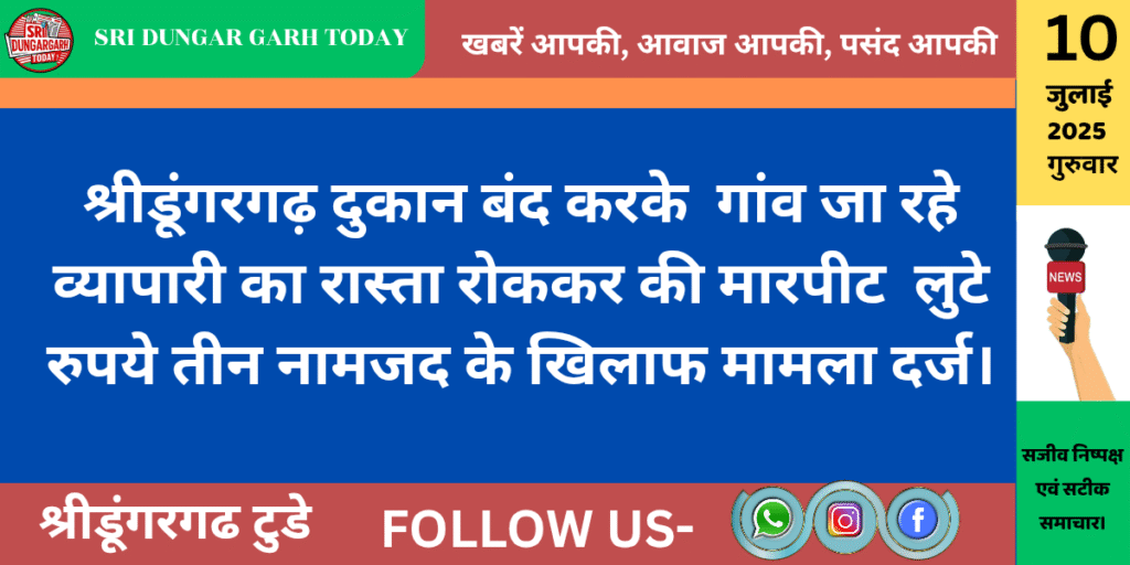 श्रीडूंगरगढ़ दुकान बंद करके गांव जा रहे व्यापारी का रास्ता रोककर की मारपीट लुटे रुपये तीन नामजद के खिलाफ मामला दर्ज