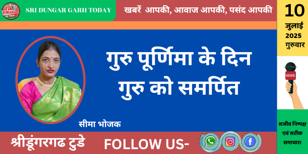 आज गुरू पूर्णिमा है। ‘इस शुभ अवसर पर हमें अपने समस्त गुरुजनों को हाथ जोड़कर, स्मरण करके नमन करना चाहिए। “गुरु वह मोमबत्ती है जो स्वयं जलकर दूसरों को रोशनी प्रदान करती है। वर्तमान युग में हमारे बच्चों को सच्चे और अच्छे गुरुजनों की महती आवश्यकता है। आज बच्चों की स्थिति अत्यन्त भयावह हो गई है इस कलयुग रूपी काल से हमें हमारे -बच्चों को बचाना है तो तो इसके लिए हमें सच्चे गुरु की आवश्यकता है। गुरु का स्थान हमारे जीवन में भगवान से भी ऊँचा है। गुरु शिष्य को जीवन में सच्ची राह दिखाता है ऊँचाइयों को हासिल करने का रास्ता बताता है। आज स्थिति ये हो गई है कि बच्चे मोबाइल के कारण दिन प्रतिदिन बिगड़ते जा रहे हैं, उनके नैतिक मूल्यों का विघटन होता जा रहा है, कोई अच्छी बात बताते हैं फिर भी बच्चों पर कोई असर नहीं हो रहा है, ऐसी स्थिति में हमें एक अच्छे शिक्षक की महती आवश्यकता है।.