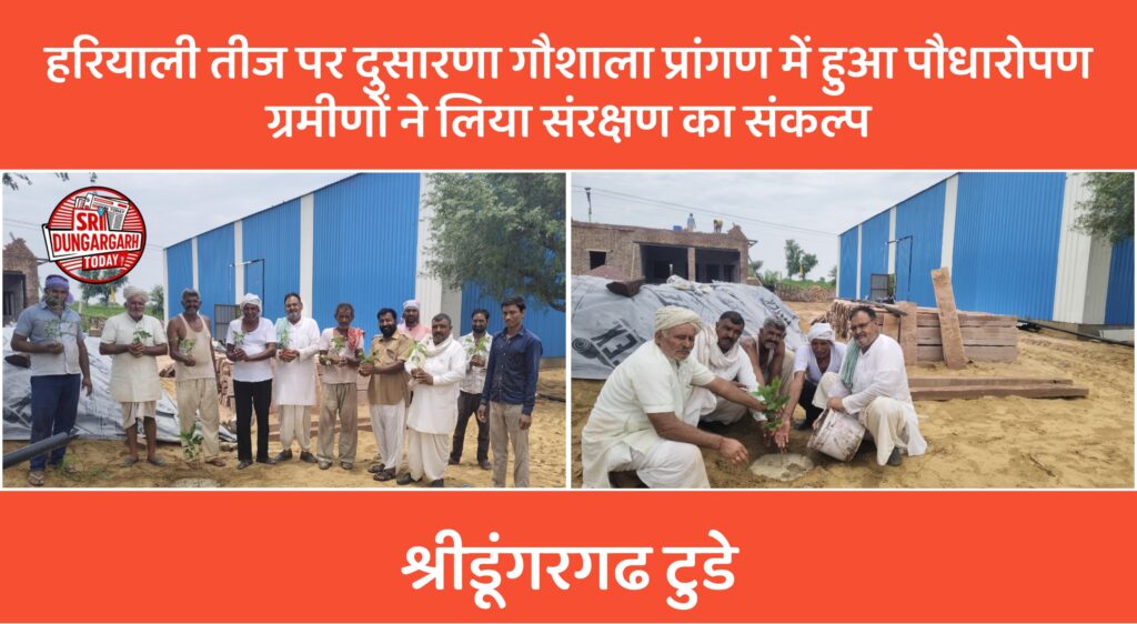 श्री कृष्णा गौ सेवा समिति दुसारणा गौशाला में आज हरियाली तीज पर गौशाला कमेटी के द्वारा हारियालों राजस्थान अभियान व एक पेड़ मां के नाम अभियान के अंर्तगत पौधारोपण का कार्यक्रम आयाजित किया। गौशाला के अध्यक्ष मोहनलाल गोदारा ने बताया कि पौधारोपण का उद्देश्य पर्यावरण संरक्षण को बढ़ावा देना है। उन्होंने कहा कि हम सभी को जीवन मे एक पेड़ अवश्य लगाना चाहिए इस दौरान गौशाला प्रांगण में विभिन्न प्रकार के छायादार व फलदार पौधे लगाए। गौशाला अध्यक्ष मोहनलाल गोदारा, भामाशाह पेमाराम गोदारा, गौशाला के भूमि दानदाता रूघाराम मुंड, रामप्रताप सारण, सांवरदास स्वामी, भगवान दास, परमेश्वर, अगर सिंह कोटासर कोजुनाथ सहित बड़ी संख्या में ग्रमीणों ने पौधो का रोपण कर पर्यावरण संरक्षण का संदेश दिया। तथा सभी मे पौधो की देख-रेख व सुरक्षा का संकल्प लिया।