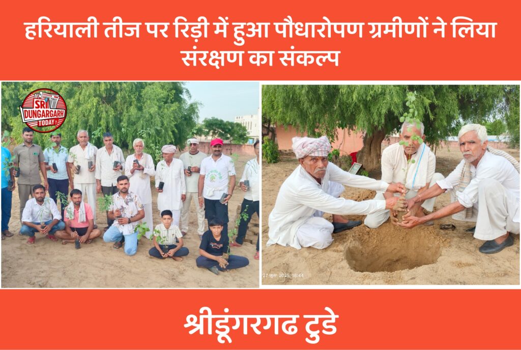 क्षेत्र के गांव रीड़ी में आज हरियाली तीज पर हरित क्रांति रिड़ी टीम द्वारा पुरनाथ सिद्ध की अगुवाई में पौधारोपण का कार्यक्रम आयोजित किया गया। इस दौरान गाँव के श्री गुरु देव जसनाथ जी महाराज व श्री सालानाथ जी महाराज की बाड़ी मे विभिन्न प्रकार के छायादर व फलदार पौधे लगाए गए। सामजिक कार्यकर्ता पुरनाथ सिद्ध ने बताया कि पौधारोपण का उद्देश्य पर्यावरण संरक्षण को बढ़ावा देना तथा हरित रीड़ी का सपना साकार करना है। पुरनाथ ने कहा की सभी को एक पेड़ अवश्य लगाना चाहिए। इस दौरान ग्रामीणों ने पुरनाथ की खूब प्रशंसा की ग्रमीणों ने कहा कि पुरनाथ द्वारा समय समय पर पौधारोपण का कार्यक्रम आयोजित करना और इसके लिए लोगो को जागरूक करना बहुत ही शानदार कार्य हैं । उन्होंने कहा अगर सभी मिलकर इस मुहिम में साथ दे तो जल्दी ही हरित रिड़ी का सपना साकार होगा। इस दौरान पूर्व सरपंच गोपालाराम सहु ,पूर्व सरपंच रामकरणनाथ बलिहारा ठेकेदार कालूनाथ सिद्ध, कृषि पर्यवेक्षक रामकरणनाथ सिद्ध, आदुनाथ सिद्ध , नोरगनाथ सिद्ध, रामचंद्रनाथ सिद्ध पुरनाथ सिद्ध, किशन जाखड़, प्रेमनाथ सिद्ध प्रेमनाथ कुकणा, मुनीनाथ सिद्ध, लालनाथ सिद्ध गोविन्द सिद्ध, दीनानाथ, पदमनाथ सहित बड़ी संख्या में ग्रमीणों ने पौधों का रोपण किया। पुरनाथ सिद्ध ने बताया कि पौधों की देखभाल की जिम्मेदारी स्थानीय ग्रामीणों को दी गई है।