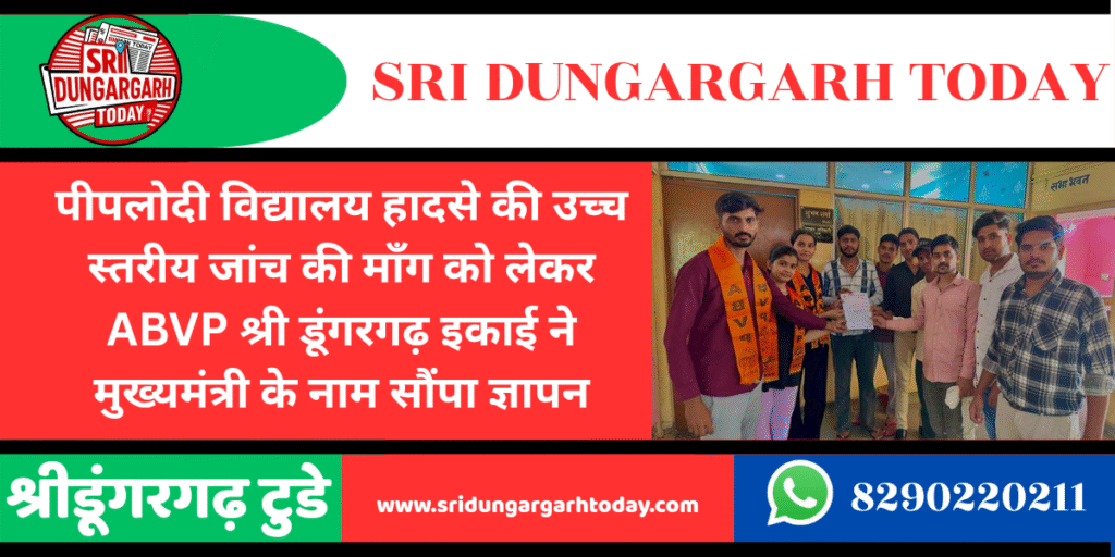 अखिल भारतीय विद्यार्थी परिषद श्री डूंगरगढ़ इकाई द्वारा झालावाड़ जिले के मनोहरवाड़ा क्षेत्र के पीपलोदी स्कूल की छत गिरने से हुए हादसे की जांच हेतु मुख्यमंत्री के नाम उपखण्ड अधिकार को ज्ञापन दिया गया।