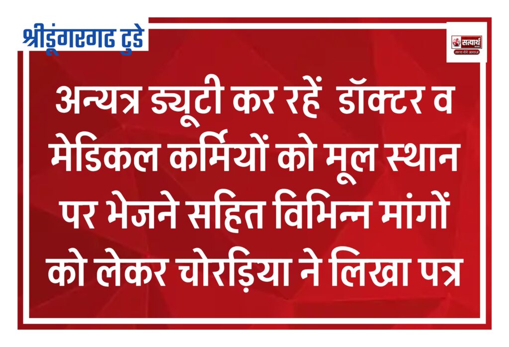 उपजिला अस्पताल के अन्यत्र ड्यूटी करने वाले डॉक्टर व मेडिकल कर्मियों को तुरंत उनके मूल स्थान पर भेजने व रेडियोलोजिस्ट की नियुक्ति व दिन के समय सुरक्षा गार्ड की ड्यूटी लगाए जाने मांग करते हुए लोक समता समिति के महासचिव तुलसीराम चोरड़िया ने मुख्य चिकित्सा अधिकारी को पत्र भेजा है। चोरड़िया ने पत्र में मांग कि है कि उपजिला अस्पताल में सेवाए दे रहे दंतरोग विशेषज्ञ प्रियंका गोस्वामी, चर्मरोग विशेषज्ञ कौशल्या स्वामी, ईएनटी डॉ विवेक मालमानी, लेब टेक्नीशियन गौरव सहित जो भी स्वास्थ्य कर्मी अन्यत्र ड्यूटी कर रहें है उन्हें तुरंत अस्पताल में ड्यूटी दी जावें। ताकि उपजिला अस्पताल में बिगड़ी हुई स्वास्थ्य सेवा में सुधार हो इसके साथ ही सोनोग्राफी मशीन से जांच एक महीने में तीन दिन ही जिसके कारण रोगियों को विशेष लाभ नही मिल रहा है। जिसके लिए परमानेंट रेडियोलोजिस्ट की नियुक्ति की जाए अस्पताल में आए दिन हो रही चोरियों की रोकथाम के लिए सुरक्षा गार्ड की ड्यूटी लगाई जाए।