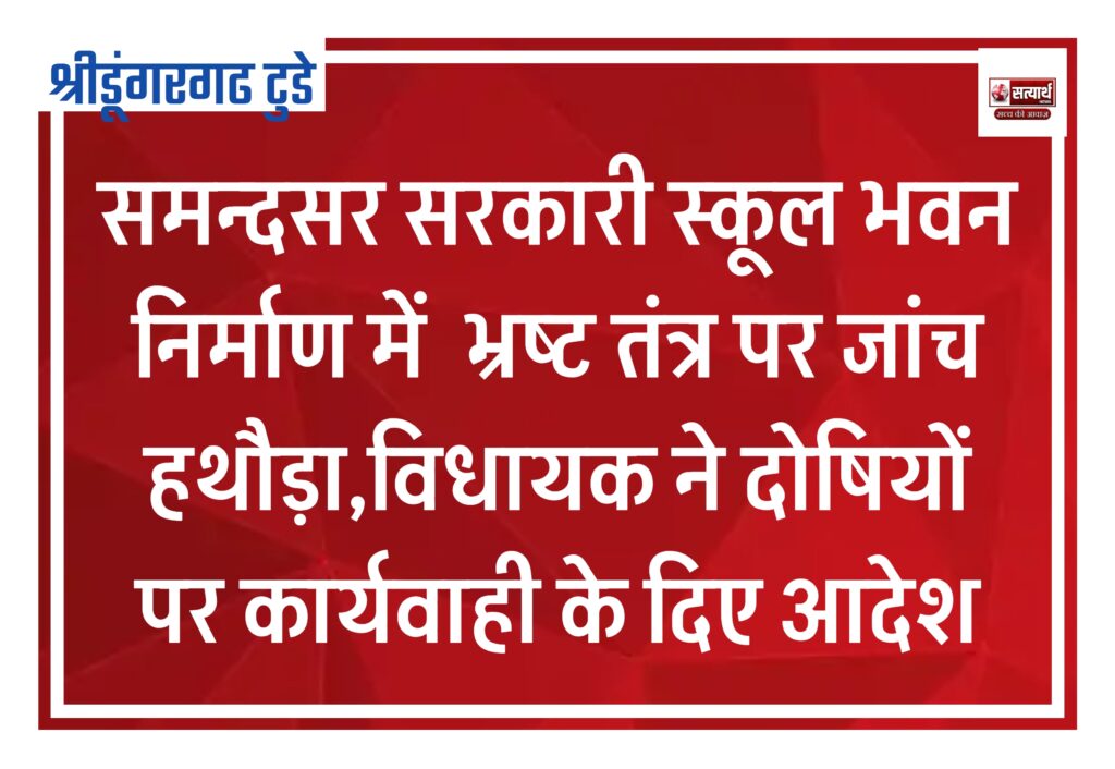 आज श्रीडूंगरगढ़ गांव समन्दसर के राजकीय उच्च माध्यमिक विद्यालय में घटिया निर्माण कार्य की जांच के लिए स्थानीय विधायक ताराचंद सारस्वत व ग्रामीणों के दबाव से आज समसा विभाग AEN राजाराम सोनी व JEN मदन गोपाल गोयल कार्यस्थल का पर पहुंचे व गुणवत्ता सम्बंधित जांच की जिसमें उन्होंने भारी अनियमितता पाई इस संबंध में श्रीडूंगरगढ़ विधायक ताराचंद सारस्वत ने AEN से भ्रष्टाचार कार्य में लिपापोती पर नाराजगी जताते हुई दोषियों पर कड़ी कार्रवाई करने का निर्देश विभागीय अधिकारियों को दिया AEN ने ठेकेदार को दोषी मानते हुए छत सहित पूरे ढांचे को दूबारा बनाने की रिपोर्ट विभाग को सौंपने व कार्य दुबारा करवाने के आदेश जारी किया प्रचार्य पुष्पा कोली ने बताया की उनके व ग्रामीणों द्वारा समय समय पर कार्य अनियमितता की शिकायत के बारे में प्रशासन को अवगत करवाया। बता देवे इस मुद्दे को श्रीडूंगरगढ़ टुडे ने भी प्रमुखता से उठाया था। जांच के दौरान मांगीलाल गोदारा पूर्व अध्यक्ष राजकीय डूंगर महाविद्यालय बीकानेर, भारूराम तर्ड़, मामराज गोदारा,नोरत राम शर्मा, श्योपत गोदारा,हंसराज आंवला, रेवन्त राम भादू सहित बड़ी संख्या में गांव के मौजिज लोग व परिजन मौके पर मौजूद रहे।
