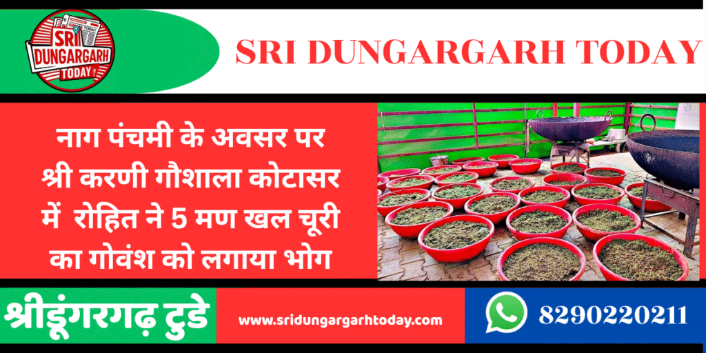 श्री करणी गौ सेवा समिति कोटासर गौशाला में आज नाग पंचमी के अवसर पर गौशाला के भामाशाह रोहित कुमार झालरिया श्रीडूंगरगढ़ ने 5100 की राशि समर्पित कर गौशाला की गो माताओं 5 मण खल चूरी भंडारा गौ माताओं को भोग लगाकर नाग पंचमी का पर्व मनाते हुए गौ सेवा का सौभाग्य प्राप्त किया गौशाला कमेटी ने बताया कि रोहित कुमार झालरिया समय-समय पर गौ सेवा करते रहते हैं। गौशाला कमेटी ने रोहित कुमार झालरिया का आभार व्यक्त करते हुए धन्यवाद ज्ञापित किया।