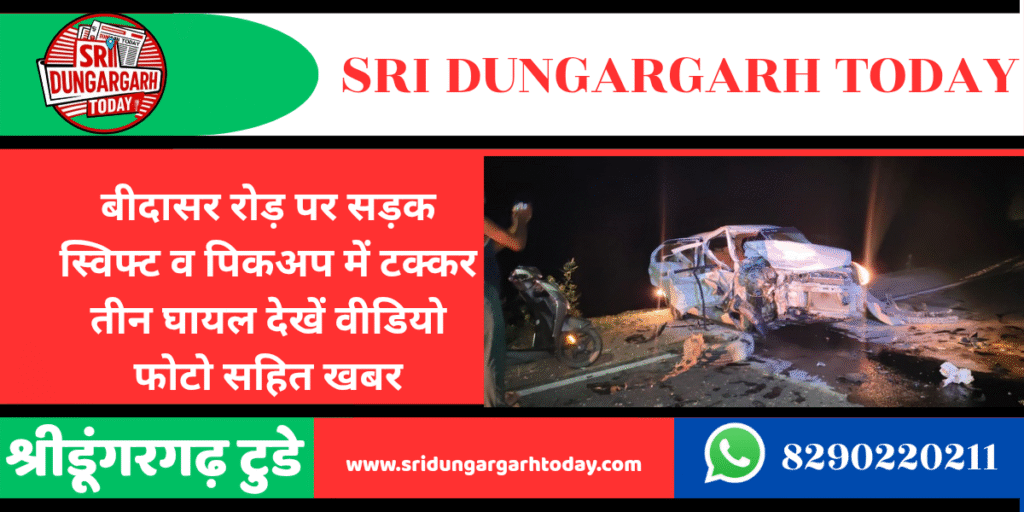 सोमवार देर रात्रि बीदासर रोड़ पर एक पिकअप और स्विफ्ट गाड़ी की आमने सामने की टक्कर में तीन लोग घायल हो गए जिसमें पिकअप सवार गंभीर घायल हुआ।प्राप्त जानकारी के अनुसार, सोमवार देर रात्रि श्रीडूंगरगढ़ से बाना की ओर मध्य मार्ग में एक पिकअप और स्विफ्ट कार की टक्कर हो गई। टक्कर इतनी तेज थी कि दोनों गाड़ियां चकनाचूर हो गई। स्विफ्ट में कुल 3 लोग सवार थे जिसमें कुंतासर निवासी 22 वर्षीय राजेश पुत्र सोहनलाल और बाना निवासी 18 वर्षीय महेंद्र पुत्र सीताराम घायल हो गए। पिकअप में सवार बाना निवासी 35 वर्षीय अमरचंद पुत्र जैसाराम नायक घायल हो गया।इन तीनों घायलों को निजी गाड़ी द्वारा श्रीडूंगरगढ़ उपजिला अस्पताल लाया गया। जहां से पिकअप चालक अमरचंद नायक को गंभीर अवस्था में बीकानेर रेफर किया गया है। मौके पर पुलिस पहुंची। दोनों वाहनों को मार्ग से हटाकर यातायात को सुचारू करवाया।