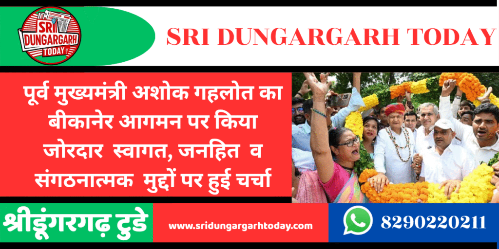 पूर्व सीएम अशोक गहलोत आज बीकानेर दौरे पर रहें और इस अवसर श्रीडूंगरगढ़ के पीसीसी सदस्य सहित नेताओं और कार्यकर्ताओं ने गर्मजोशी के साथ उनका स्वागत किया कार्यकर्ताओं ने गहलोत को सम्मान साफा पहनाकर व पुष्पगुच्छ भेंट कर सम्मानित किया। इस दौरान गहलोत से पंचायतीराज चुनाव शीघ्र करवाए जाने के लिए मांग विधानसभा में उठाने की बात ही कही। इस दौरान स्वागत करने वालों में पीसीसी सदस्य हरिराम बाना, ब्लॉक अध्यक्ष राधेश्याम सिद्ध, सेवादल के संभाग प्रभारी विमल भाटी, रमेश प्रजापत, संतोष गोदारा, डालूराम मेघवाल, किशन सियाग, ओमप्रकाश मेघवाल, पूर्व सरपंच धर्मपाल बांगड़वा, मुन्नीराम भादू, हेतराम डेलू, रेखाराम लुखा, प्रकाश दुसाद मौजूद रहें। सभी कार्यकर्त्ताओं ने मिलकर जमकर नारेबाजी करते हुए गहलोत का स्वागत किया।