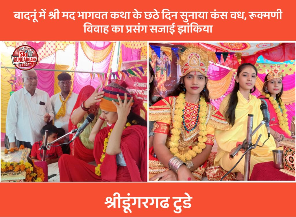 क्षेत्र के गांव बादनु के शिव मंदिर में  आयोजित  श्रीमद् भागवत कथा में आज छठे दिन कथा वाचिका बज्र राधे किशोरी जी ने  कंस का बद्ध कर मे रुकमणि विवाह का प्रसंग सुनाया आज कथा में  झांकिया सजाई गई   जिनका  दर्शन कर ग्राम वासियों ने कथा को आनंद के साथ भव्य रूप दिया। आज की कथा में कथा प्रेमी हरिराम भादू लिखमीसर दिखनादा परिवार सहित पहुंचे। उन्होंने कथा वाचीका ब्रज  राधे किशोरी का साफा पहनाकर स्वागत कर व्यास पीठ से आशीर्वाद लिया आज की कथा में बड़ी संख्या में ग्रामीण पहुंचे।   कथा में पधारे हुए सभी श्रद्धालुओं का आयोजन कमेटी ने  आभार जताया।
