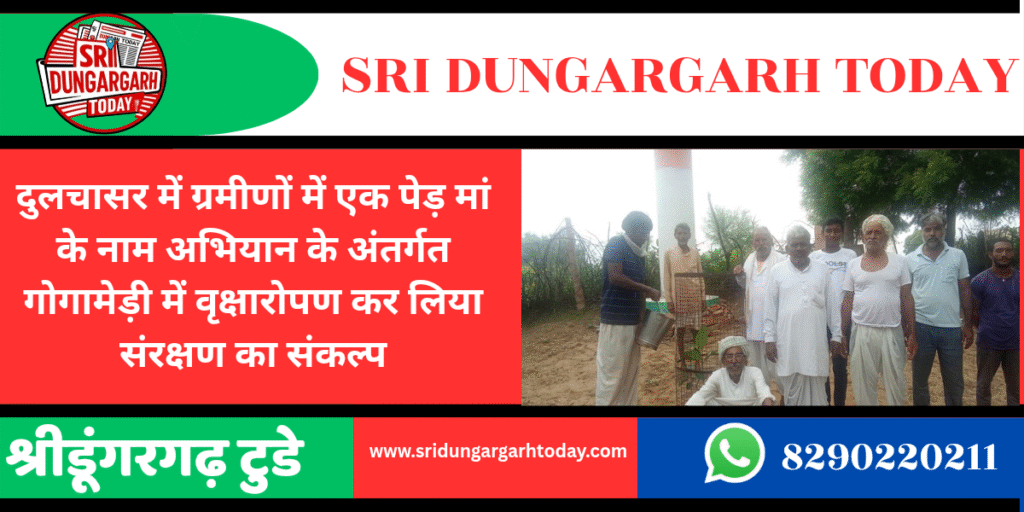 श्रीडूंगरगढ़ क्षेत्र के गांव दुलचासर की गोगामेड़ी में एक पौधा गौ माता के नाम के अभियान के तहत वृक्षारोपण का आयोजन किया गया जिसमें ग्रमीणों ने एकत्रित होकर सामुहिक रूप से पौधारोपण कर पर्यावरण संरक्षण का संदेश दिया इस दौरान विभिन्न प्रकार के छायादार पौधे लगाए गए। पर्यावरण प्रेमी गोगामेड़ी भक्त मूलाराम, दानाराम महिया उमानाराम, गोविंदराम, शेरसिंह, कल्याण सिंह,किशनलाल, पवन, सुनील,सहित बड़ी संख्या में उपस्थित ग्रमीणों ने एक-एक वृक्षारोपण किया। रेवन्त सिंह पड़िहार ने बताया कि सभी ने पौधों के रख रखाव की जिम्मेदारी का संकल्प लिया और साथ में गौ सेवा करने का भी संकल्प लिया।