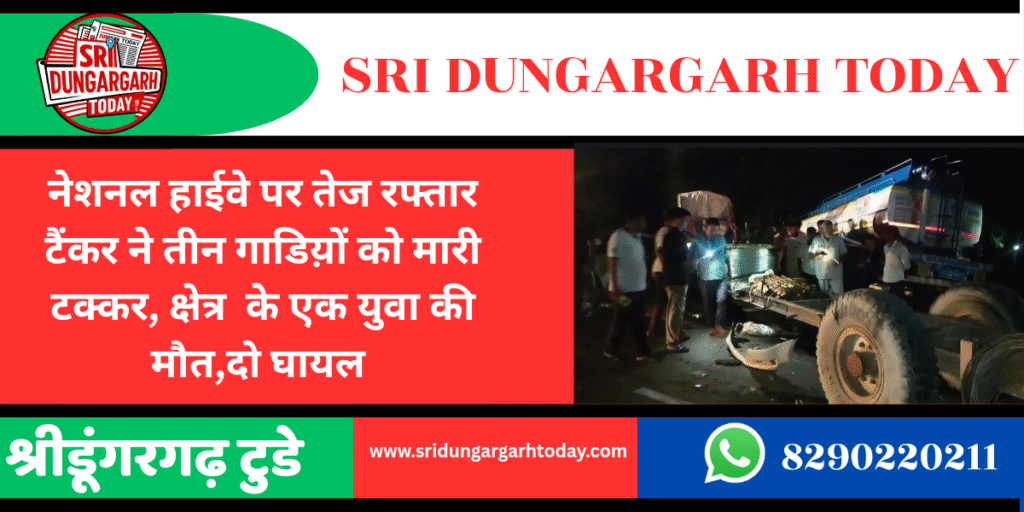 नेशनल हाईवे पर तेज रफ्तार टैंकर ने तीन गाडिय़ों को मारी टक्कर, क्षेत्र के एक युवा की मौत,दो घायल