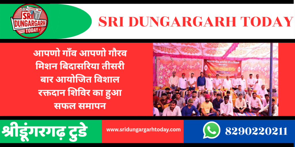 जसरासर। ग्राम बीदासरिया में आज तीसरी बार आयोजित विशाल रक्तदान शिविर का सफलतापूर्वक समापन हुआ। सामाजिक कार्यकर्ता सोहनलाल मेघवाल ने कहा कि इस अवसर पर बड़ी संख्या में ग्रामवासियों, युवाओं ने उत्साहपूर्वक भाग लिया और मानवता की सेवा में अपने रक्त का दान किया। शिविर का आयोजन आपणो गाँव आपणो गौरव मिशन बिदासरिया के सहयोग से किया गया, जिसमें कुल 71 यूनिट रक्त एकत्रित किया गया। कार्यक्रम के समापन अवसर पर आयोजकों ने सभी रक्तदाताओं, स्वयंसेवकों और सहयोगियों का आभार प्रकट किया। इस अवसर पर श्री मोडाराम मेघवाल जिला प्रमुख बीकानेर, बिसनाराम सियाग कांग्रेस जिला अध्यक्ष बीकानेर, राम रतन तरड प्रधान प्रतिनिधि पंचायत समिति नोखा, डॉ राजेंद्र मुंड पीसीसी महासचिव कांग्रेस राजस्थान, कनीराम तरड पूर्व पंचायत समिति सदस्य नोखा, धूड़ा राम डेलू सरपंच ग्राम पंचायत लिखमीसर दिखनादा, संग्राम राम हुड्डा सरपंच ग्राम पंचायत मसूरी, राजूराम घनघस पूर्व सरपंच, रेवत राम राशन डीलर, श्रवण कुमार लुखा वार्ड पंच, मालू सिंह वार्ड पंच, देवाराम घनघस सहित अन्य जनप्रतिनिधि ग्राम वासी उपस्थित हुए। सभी जनप्रतिनिधियों का माला व साफा पहनाकर स्वागत किया गया। मुख्य अतिथि मोडाराम मेघवाल जिला प्रमुख बीकानेर ने कहा कि आज का युग सोशल मीडिया का और इसी कड़ी में आपके गाँव का व्हाट्सएप ग्रुप आपणो गाँव आपणो गौरव मिशन बिदासरिया आज तीसरी बार रक्तदान शिविर लगाया है जो बड़ी खुशी की बात है कि रक्तदान महादान है, और गांव के युवाओं की यह पहल समाज के लिए प्रेरणादायक है। कार्यक्रम में सभी प्रतिभागियों को प्रमाण पत्र प्रदान किए गए। आयोजक कमेटी अध्यक्ष चतराराम गोदारा ने कहा कि प्रथम बार से लेकर आज तीसरी बार का समापन अवसर पर ग्रामीणों ने यह संकल्प लिया कि आगे भी इस प्रकार के सेवा कार्यों को निरंतर जारी रखा जाएगा।