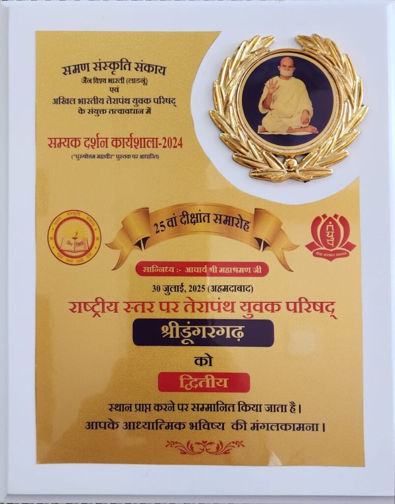 समण संस्कृति संकाय जैन विश्व भारती लाडनूं एवं अखिल भारतीय तेरापंथ युवक परिषद के संयुक्त तत्वाधान में आयोजित सम्यक दर्शन कार्यशाला 2024(पुरुषोत्तम महावीर पुस्तक पर आधारित ) 25वें दीक्षांत समारोह अहमदाबाद में आचार्य श्री महाश्रमण जी के पावन सान्निध्य में तेरापंथ युवक परिषद श्रीडूंगरगढ़ को राष्ट्रीय स्तर पर द्वितीय स्थान मिला