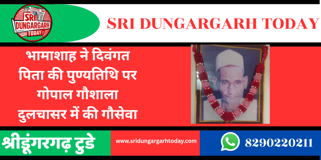 श्रावण शुक्ल पक्ष कि दशमी को  नन्द किशोर मुंधड़ा निवासी दुलचासर प्रवासी मुंबई ने अपने पुज्य पिताजी दिवंगत गंगाबिशन मूंधड़ा की 30वीं पुण्य तिथि पर  गोपाल गौशाला दुलचासर की समस्त गौ माता  को  खल, मुंग चूरी तथा गुड़ का पावन भंडारा कर भोग लगाया । सचिव रेवन्त सिंह पड़िहार ने बताया कि मुंधड़ा परिवार ने गौशाला की गौ माताओं के लिए रू3100/-की पावन राशि भी समर्पित कर पुण्य आत्मा के शांति की कामाना की। गौशाला कमेटी ने मुंधड़ा परिवार का आभार व्यक्त कर मंगल कामना की ।
