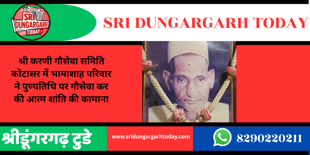 श्री करणी गौसेवा समिति कोटासर में आज दुलचासर माहेश्वरी समाज के भामाशाह  मोतीलाल  हुकमचंद  मूंधड़ा दुलचासर हाल भिवंडी (बॉम्बे) एवं मूंधड़ा परिवार जनों ने 3100रू की राशि समर्पित कर आज अपने पूर्वज स्वर्गीय  गंगाविशन मूंधड़ा की 30वीं पुण्यतिथि पर 1बड़ी कड़ाई खल मुंग चूरी का भंडारा गो ग्रास के रूप समर्पित कर आत्म शांति की कामना की । कमेटी ने  मूंधड़ा परिवार गो सेवा में समर्पित भाव से जुड़ा है अनेक गौशालाओं  परिवार के द्वारा अनवरत गौ सेवा चल रही है।