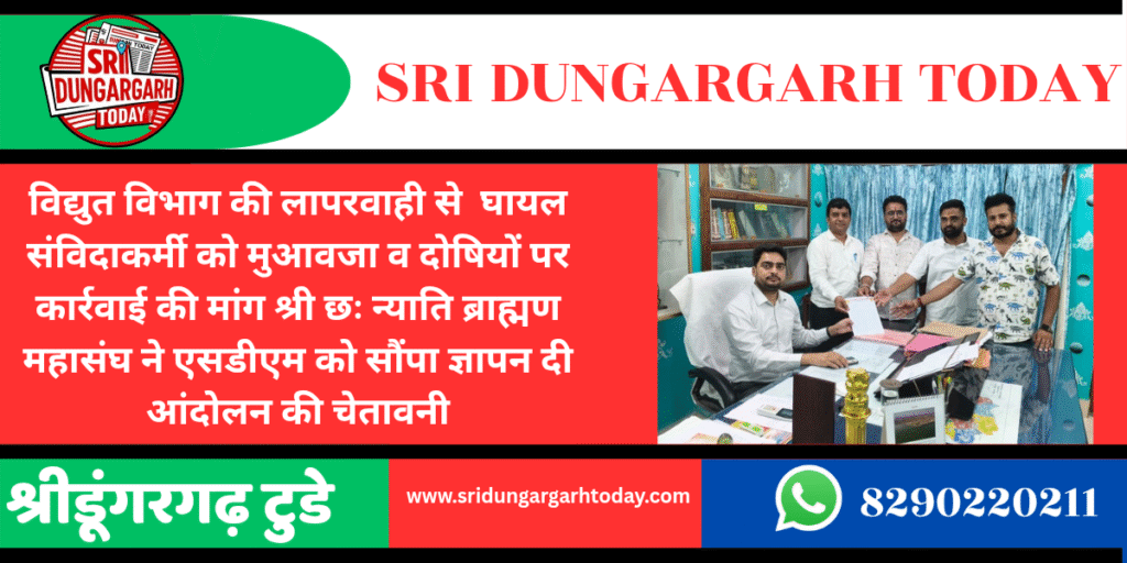 जोधपुर विद्युत वितरण निगम लिमिटेड के अधीनस्थ 33/11 केवी जीएसएस उदरासर में कार्यरत संविदाकर्मी मुन्नीराम पुत्र श्री हनुमानराम जो पिछले 8 सालों से अपने कर्तव्य निष्ठा से कार्य कर रहा था। 28 जुलाई 2025 को 4:30 बजे बिजली के पोल में फॉल्ट सुधारने हेतु जेईएन नारायण शुक्ला अपने साथ लेकर गए। लगभग 4:50 बजे जेईएन नारायण शुक्ला ने शटडाउन लेकर मुन्नीराम को पोल पर चढ़ा दिया। मुन्नीराम पोल पर चढ़कर कार्य कर रहा था, उसी समय जीएसएस पर पदस्थापित विभागीय कर्मचारी भंवरलाल द्वारा बिना किसी पूर्व सूचना के बिजली आपूर्ति चालू कर दी गई। इसके परिणामस्वरूप मुनिराम करंट की चपेट में आकर बुरी तरह से झुलस गया और नीचे गिर पड़ा यह दुर्घटना विभागीय लापरवाही और सुरक्षा मानकों की अवहेलना का स्पष्ट उदाहरण है। घटना के बाद घायल मुन्नीराम को जेईएन नारयण शुक्ला उसे श्रीडूंगरगढ़ उपजिला अस्पताल लेकर पहुंचे जहां मुन्नीराम को गम्भीर अवस्था मे होने रीढ की हड्डी टूटने के कारण तत्काल बीकानेर स्थित पीबीएम अस्पताल के ट्रॉमा सेंटर में रेफर कर दिया। जहाँ वे वर्तमान में जीवन रक्षक चिकित्सा के अंतर्गत भर्ती हैं। उनकी हालत नाजुक बनी हुई है और परिवार बेहद परेशान है। उक्त गंभीर स्थिति को देखते हुए श्री छः न्याति ब्राम्हण महासंघ श्रीडूंगरगढ़ बीकानेर की ओर से एक प्रतिनिधिमंडल ने उपखंड अधिकारी को ज्ञापन सौंपा ज्ञापन में बताया की जीएसएस पर कार्यरत्त कमर्चारी व बिजली विभाग की लापरवाही के कारण मुन्नीराम करंट की चपेट में आया लेकिन इतना बड़ा हादसा हो जाने के बाद भी विभाग का एक भी कर्मचारी मिलने नही पहुंचा और अभी तक परिजनों से बातचीत भी नही की। ज्ञापन में मांग की गई कि घायल मुन्नीराम को समुचित विशेषज्ञ चिकित्सा सुविधा तुरंत उपलब्ध करवाई जाए और किसी भी स्तर पर लापरवाही न हो। ज्ञापन में मांग की गई इसके साथ ही पीड़ित को पचास लाख का मुआवजा आश्रित परिवार के एक सदस्य को सरकारी नोकरी, मुन्नीराम को आजीवन पेंशन तथा दोषी कार्मिक व जेईएन को तुरंत प्रभाव से सस्पेंड नहीं किया जाता है तो उग्र आंदोलन किया जायेगा, जिसके लिये प्रशासन तथा बिजली विभाग स्वंय जिम्मेदार होगा। ज्ञापन के दौरान कौशल शर्मा (श्री छः न्याति ब्राम्हण महासंघ जिलाध्यक्ष, हरिकांत शर्मा आईदान पारीक धनेरू (तहसील अध्यक्ष) घनश्याम पंचारिया,रजत आसोपा (शहर अध्यक्ष),एडवोकेट प्रवीण पालीवाल ( तहसील महामंत्री) सहित अनेक पदाधिकारी मौजूद रहे।