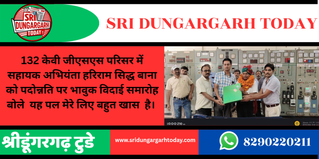 राजस्थान राज्य विद्युत प्रसारण निगम लिमिटेड के श्रीडूंगरगढ़ स्थित 132 केवी जीएसएस कार्यालय परिसर में सोमवार को एक भावुक विदाई समारोह का आयोजन किया गया, जिसमें सहायक अभियंता (AEN) श्री हरीराम सिद्ध बाना को अधिशासी अभियंता (XEN) पद पर पदोन्नति होने पर सम्मानित कर भावभीनी विदाई दी गई कार्यक्रम में 220 केवी जीएसएस के XEN अतुल गौड़, AEN रविंद्र सिंह राठौड़, AEN डिस्कॉम चंद्रेश यादव, कनिष्ठ अभियंता बृजमोहन सैनी, JEN दिवाकर मिश्रा, एवं ARO ओमनाथ सिद्ध सहित कई अधिकारी एवं कार्मिक मौजूद रहे। सभी ने बाना का फूलमाला, साफा एवं अभिनंदन पत्र भेंट कर सम्मान किया और उनके उज्ज्वल भविष्य की मंगलकामनाएं प्रेषित कीं। सभी साथियों ने एक स्वर में कहा, “हमें गर्व है कि हमने आपके साथ कार्य किया। हमें विश्वास है कि आप सफलता की नई ऊंचाइयों को छुएंगे और हमेशा हमें याद रखेंगे।” विदाई के भावुक पलों में XEN हरीराम सिद्ध बाना ने सभी का आभार व्यक्त करते हुए कहा, “यह मेरे लिए अत्यंत भावुक क्षण है। मैं उन सभी साथियों का दिल से धन्यवाद देता हूं, जिन्होंने इस यात्रा को अविस्मरणीय बनाया। आप सभी को भविष्य के लिए मेरी ढेरों शुभकामनाएं।” इस अवसर पर विभाग के कई कर्मचारी उपस्थित रहे, जिनमें क्यामुद्दीन, मुकेश बाना, करणी सिंह, दुष्यंत सिंह, शिवरतन प्रजापत, प्रमोद, सतपाल, देवेंद्र, सुरेश बिश्नोई आदि शामिल रहे। कार्यक्रम का सफल संचालन JEN बृजमोहन सैनी ने किया और अंत में सभी आगंतुकों का आभार व्यक्त किया।
