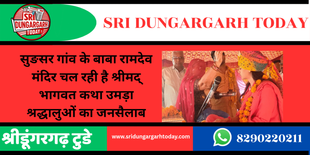 क्षेत्र के गांव सूडसर के बाबा रामदेवजी मंदिर में चल रहे सात दिवसीय भागवत कथा के पांचवें दिन श्रद्धालुओं का जन सैलाब उमड़ा पांचवें दिवस पर कथा वाचीका ब्रिज राधे किशोरी ने कृष्ण बाल लीलाओं का व्याख्यान करते हुए माखन चोरी लीला सुनाई । आज की कथा में लिखमीसर दिखनादा से समाज सेवी हरिराम भादू परिवार सहित पधारे व्यास पीठ का पूजन कर कथावाचक को माला व साफा पहना कर पुष्प वर्षा कर व्यास पीठ का सम्मान किया गया इस दौरान उपसरपंच मोहन सिंह राजपूत लिखमीसर उपस्थित रहे। क्षेत्र के आस पास के कई गांवों से श्रद्धालु पधारे कथा में भारी संख्या में मातृशक्ति भी कथा सुनने पधारी मंदिर के पुजारी बाबू नाथ ने बताया कि समस्त ग्रामवासी कथा में अपना सहयोग भी कर रहे हैं और विशेष रूप से जेठाराम भादू, गिरधारी भादू, शंकर भादू तोलाराम भादू मोहन राम भादू सहित समस्त ग्रामवासी कथा व्यवस्था मे युवा भी अपनी सेवाएं दे रहे है। श्रीमद् भागवत कथा का लाइव प्रसारण एस. एम. के. स्टूडियो ऑफिशल चैनल पर सीधा लाइव प्रसारण हो रहा है।