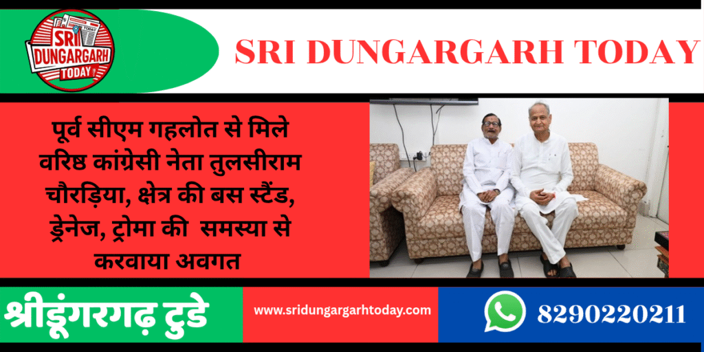 श्रीडूंगरगढ़ की राजनीति में सक्रिय भूमिका निभा चुके कांग्रेस के वरिष्ठ नेता तुलसीराम चौरड़िया ने जयपुर में राजस्थान के पूर्व मुख्यमंत्री अशोक गहलोत से उनके सिविल लाइंस स्थित आवास पर मुलाकात कर क्षेत्र की जनसमस्याओं और राजनीतिक स्थिति पर विस्तार से चर्चा की। । इस दौरान चौरड़िया ने कस्बे की तीन बड़ी समस्याओं पर ध्यान आकर्षित कराते हुए कहा कि जनता लंबे समय से बुनियादी सुविधाओं की कमी से जूझ रही है। उन्होंने गहलोत से आग्रह किया कि इन विषयों पर सरकार पर दबाव बनाकर जल्द समाधान करवाया जाए।