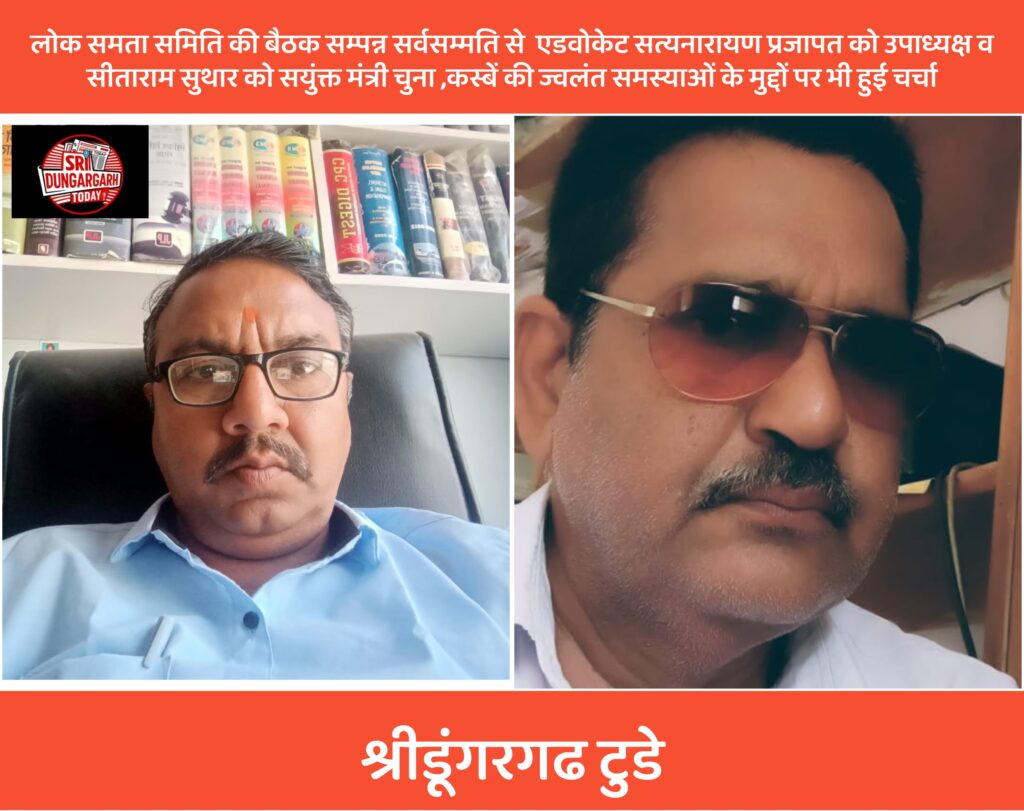 लोक समता समिति श्रीडूंगरगढ़ की आवश्यक बैठक गुरुवार को आयोजित हुई। बैठक में तहसील क्षेत्र की ज्वलंत समस्याओं पर चर्चा हुई। मुख्य रूप से कस्बे में अतिक्रमण, गंदगी और यातायात अवरोध के मुद्दे को लेकर चर्चा हुई की कस्बे में जगह-जगह बेतरतीब ढंग से वाहन खड़े रहते हैं, जिससे राहगीरों को आवागमन में परेशानी होती है। मुख्य बाजार पोस्टऑफिस और एसबीआई बैंक के सामने फैली गंदगी कीचड़ और कचरे के ढ़ेर लगे रहते है। इससे दुर्गंध फैल रही है। जिसके कारण राहीगरो का गुजरना दुर्भर हो गया है। और बीमारियों का खतरा भी बढ़ रहा है। समिति जल्द ही नगरपालिका प्रशासन व उपखंड अधिकारी से कस्बे की सफाई व्यवस्था सुधारने और अतिक्रमण हटाने की मांग करेगी ताकि आमजन को राहत मिल सके।बैठक में समिति की कार्यकारिणी का विस्तार किया गया। एडवोकेट सत्यनारायण प्रजापत को उपाध्यक्ष तथा सीताराम सुथार को संयुक्त मंत्री पद पर मनोनीत किया गया। बैठक की अध्यक्षता समिति अध्यक्ष एडवोकेट भरतसिंह राठौड़ ने की।