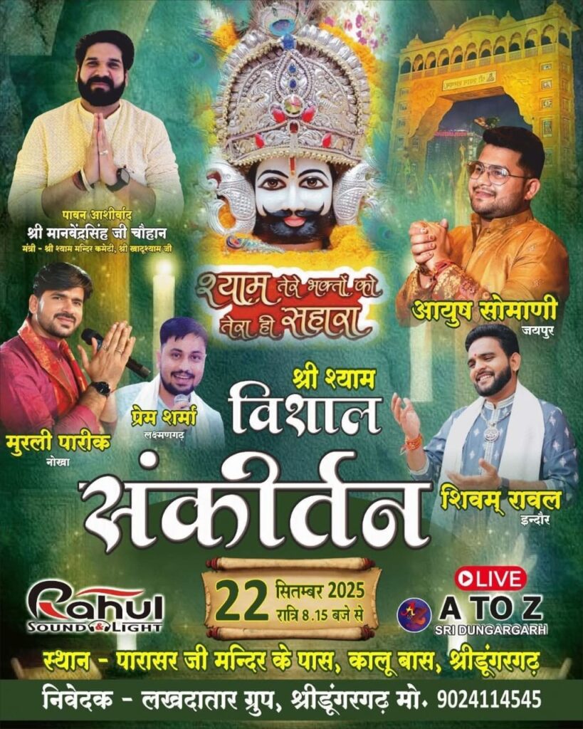 श्याम भक्तों के लिए ये खास खबर श्याम आयोजनों से जुड़ी आई है। लखदातार ग्रुप द्वारा कस्बे के कालूबास स्थित पारासर मंदिर के पास आगामी 22 सितंबर सोमवार को खाटूश्याम श्री श्याम विशाल संकीर्तन आयोजित किया जाएगा। श्याम तेरे भक्तों को तेरा ही सहारा के आह्वान के साथ आयोजित इस हो रहे इस कार्यक्रम में बाबा का भव्य सजीव दरबार फुलों से सजाया जाएगा। इस मौके पर बाबा के भजनों के साथ साथ विशेष पूजा-अर्चना के साथ महाआरती की जाएगी। जिसमे पावन आशीर्वाद मानवेंद्र सिंह चौहान (मंत्री श्री श्याम मन्दिर कमेटी खाटूश्यामजी) का रहेगा आयोजन में प्रसिद्ध श्याम भजन गायक आयुष सोमाणी (जयपुर) मुरली पारीक (नोखा) प्रेम शर्मा (लक्ष्मणगढ़) व शिवम रावल इंदौर भजनों की प्रस्तुतियां देंगे। आयोजक मंडल के सदस्यों ने बताया कि भव्य श्याम कीर्तन रात 8:15 बजे से शुरू होगा व आयोजन को लेकर भव्य तैयारियां शुरू कर दी गई है। आयोजन का लाइव प्रसारण A to Z SRI DUNGARGARH यूट्यूब चैनल पर होगा।