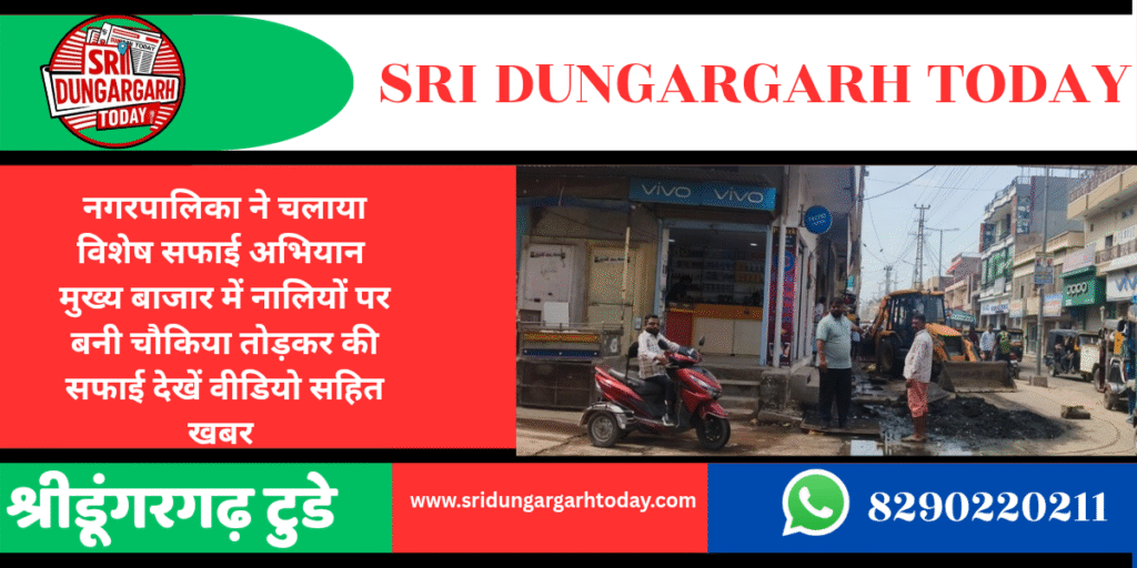 श्रीडूंगरगढ़ नगरपालिका द्वारा आज मुख्य बाजार में विशेष सफाई अभियान चलाया गया। जिसमे अवरुद्ध नालियों के कारण सड़को पर पानी फैल रहा था जिससे राहीगरो को परेशानी का सामना करना पड़ रहा था इस पर आज स्वास्थ्य निरीक्षक हरीश गुर्जर ने स्वयं मौके पर खड़े रहकर सफाई करवाई गुर्जर ने बताया कि मुख्य बाजार नाले पर बनी चौकियों के कारण नालियों में प्लास्टिक डिस्पोजल या अन्य कारण से अवरुद्ध हो जाती है। जिसको सफाई कर्मचारी को फावड़ा या मशीनों से भी निकालने में काफी समस्या हो रही थी नालियों की सफाई नही होने के कारण अवरुद्ध नालियों से पानी सड़को पर फैल जाता हैं। जिस पर आज अधिशाषी अधिकारी अविनाश शर्मा एवं नगरपालिका अध्यक्ष मानमल शर्मा के निर्देशानुसार स्वास्थ्य निरीक्षक हरीश गुर्जर द्वारा समझाइश कर नाले पर बनी चौकियों को तोड़कर नालियों व चेम्बरों की सफाई जेसीबी मशीन द्वारा करवाई गई। वही तहसील रोड से नीचे की तरफ बैंक ऑफ बड़ौदा की गली मैं भी जेटिंग मशीन द्वारा नाला सफाई का कार्य भी किया जा रहा है ।गुर्जर ने व्यापारियों व दुकानदारों से नालियो पर अतिक्रमण नही करने व कचरा नालियो में नही फेंकने की अपील की उन्होने कहा शहर को स्वच्छ रखना हम सब की जिम्मेदारी है।