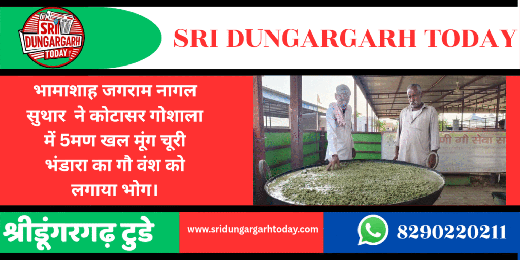 श्री करणी गौशाला कोटासर में शुक्रवार को सावन मास शुक्ल पक्ष की चतुर्दशी के अति पावन अवसर पर गौशाला के भामाशाह जगराम नागल सुथार दुलचासर ने 5100रू राशि समर्पित कर गौ वंश को खल एवं मुंग चुरी का अति पावन भंडारा गो वंश को समर्पित कर गो सेवा का सौभाग्य प्राप्त किया गौशाला प्रबंधक ने बताया कि जगराम सुथार गौशाला के शुभारंभ से लेकर आज तक अनवरत गौ सेवा करते आ रहे हैं समय-समय पर भामाशाह द्वारा गौ सेवा चलती रहती है गौशाला कमेटी ने भामाशाह परिवार का आभार जताते हुए परिवार के लिए सुख समृद्धि की कामना की। गौशाला कमेटी के सदस्यों ने एवं गो पालक परिवार ने गौ सेवा में श्रमदान कर भंडारा वितरण में सहयोग किया।