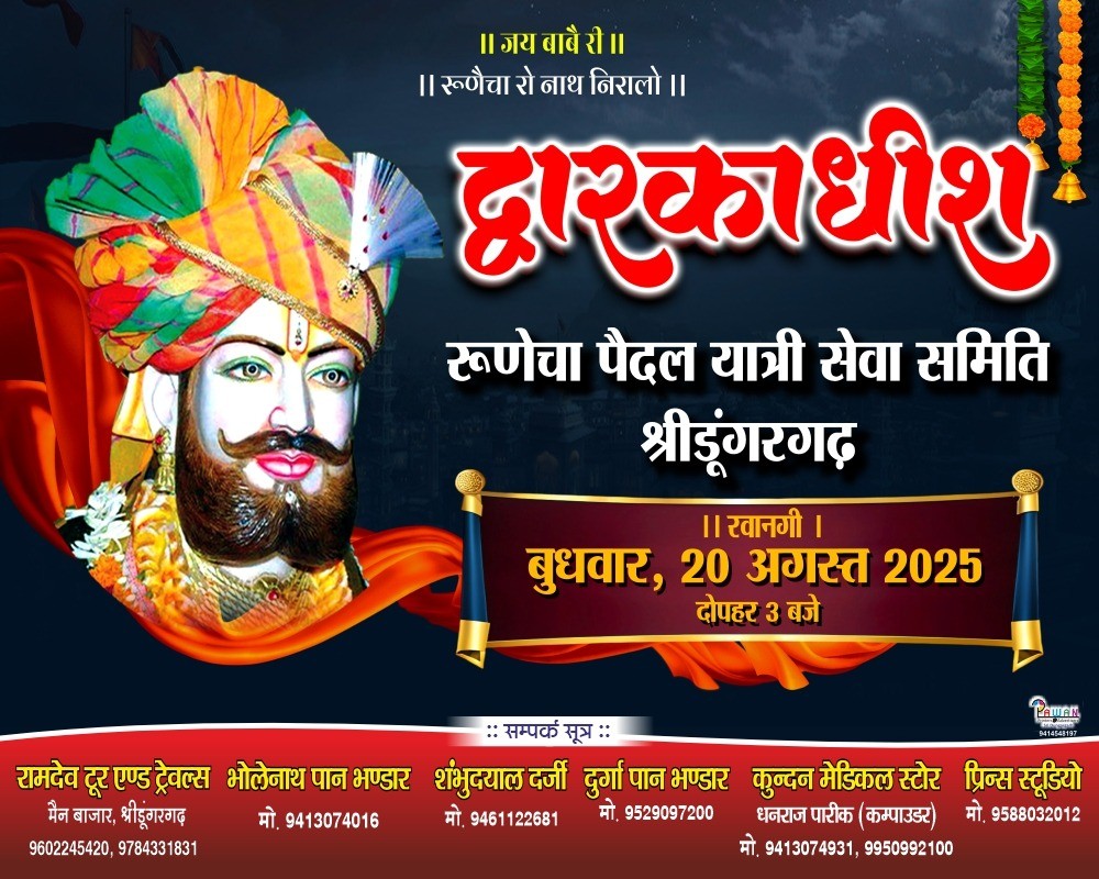 आगामी 20 अगस्त बुधवार को द्वारकाधीश रूणेचा पैदल यात्री सेवा समिति संघ दोपहर 3:15 बजे बाबा रामदेव जी का मंदिर कालुबास से बैंड बाजों के साथ भव्य जुलूस के रूप में धूमधाम से रवाना होगा। संघ के सभी सदस्यों का फुलमालाओं से स्वागत किया जाएगा। संघ सदस्यों ने यात्रा की तैयारियां प्रारंभ कर दी है। यात्रा के दौरान विभिन्न प्रकार की व्यवस्थाओं के साथ विशेष पूजन आयोजन भी होगा। वहीं संघ में शामिल होने के लिए पदयात्रियों का पंजीकरण प्रारंभ हो गया है। इच्छुक पदयात्री 9529097200 या 9461122681 पर संपर्क कर अपना नाम लिखवा सकते है।