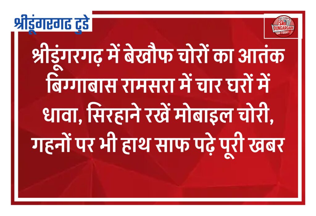 श्रीडूंगरगढ़ क्षेत्र में बेखौफ चोरों का आतंक बिग्गाबास रामसरा में चार घरों में धावा, सिरहाने रखें मोबाइल सहित गहनें पार