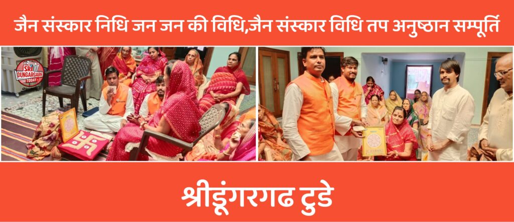 अखिल भारतीय तेरापंथ युवक परिषद के निर्देशन में तेरापंथ युवक परिषद, श्रीडूंगरगढ़ द्वारा कंचन देवी पटावरी धर्मपत्नी जगत सिंह पटावरी का रविवार  प्रातः10:00 बजे जैन संस्कार विधि से 33 की मासखमण तपस्या अनुष्ठान सम्पूर्ति कार्यक्रम मोमासर में किया गया। जैन संस्कारक प्रदीप पुगलिया और चमन श्रीमाल के साथ सहयोगी के रूप में विनय दुगड़ ने समवेत मांगलिक मंत्रोच्चार के साथ तपस्विनी से मंगलभावना पत्र स्थापित करवा कर तप अनुष्ठान सम्पूर्ति का कार्यक्रम जैन संस्कार विधि से सानन्द संपादित किया। संस्कारक प्रदीप  पुगलिया और चमन  श्रीमाल ने पटावरी परिवार को मंगलकामनाएँ प्रेषित की इस शुभ अवसर पर तपस्विनी ने एक साल तक पान का और पारिवारिक जनों ने धारणा अनुसार त्याग किये। परिवार की ओर से नौरतमल पटावरी ने तेरापंथ युवक परिषद श्रीडूंगरगढ़ एवं संस्कारको के प्रति आभार ज्ञापित किया। तेरापंथ युवक परिषद श्रीडूंगरगढ़ के कार्यसमिति सदस्य विनय दूगड़ ने मंगल भावना पत्रक भेंट करते हुए पटावरी परिवार का आभार प्रकट किया। कार्यक्रम में श्रीडूंगरगढ़ व मोमासर के तेरापंथी सभा, तेरापंथ महिला मंडल, तेरापंथ युवक परिषद,अणुव्रत समिति, संस्थाओं के पदाधिकारी ,सदस्य व पारिवारिक जनों सहित राकेश  संचेती, प्रज्ञेश बाफना, ओम बाफना सहित समाज के गणमान्य नागरिको की उपस्थिति रही।