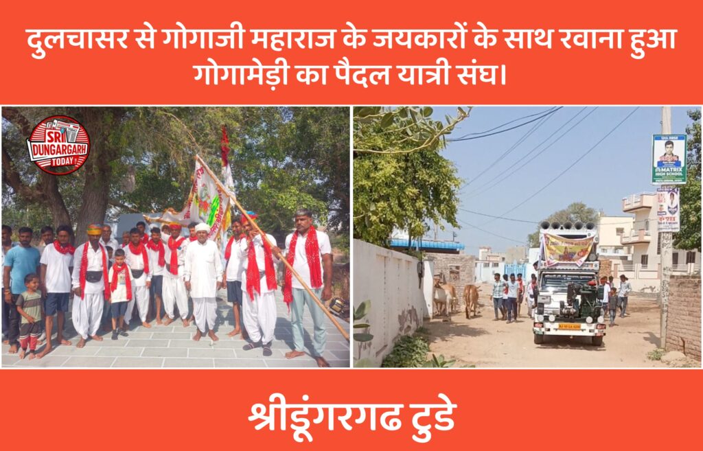 भादवा माह प्रारंभ होते ही मेलो मगरियों का उत्साह हर गांव में छा जाता है।गांव गली व लोक देवताओं के मंदिरों व देवरों के रास्तों में भक्ति का ज्वार उमड़ता नजर आने लगता है। रविवार सुबह गांव दुलचासर में स्थित गोगामेड़ी से नाचते गाते धूमधाम से लोक देवता गोगाजी महाराज की गोगामेड़ी के लिए पैदल यात्री संघ रवाना हुआ। संघ के अध्यक्ष ने बताया कि गांव की गोगामेड़ी से बासी महियान की गोगामेड़ी में दर्शन करके श्री डूंगरगढ़ होते हुए प्रस्थान करेंगे और संघ में तकरीबन 25 पदयात्री है।ग्रामीणों ने खूब जयकारे लगाए और पदयात्रियों को शुभकामनाएं दी। मेड़ी के भक्त मूलाराम नायक ने ध्वजा का पूजन करवाया व ज्योत आरती संपन्न करवाते हुए संघ को रवाना किया। संघ अध्यक्ष भैराराम नायक, बबलू नायक, प्रेम महिया उमानाराम नायक, नारायणराम नायक, भंवरलाल महिया सीताराम महिया, मुखराम नायक,गोविंद राम मामराज भागिसिंह, मास्टर देवीलाल, रामदेव,शेर सिंह बंजरग लाल रामकिशन,प्रेम, देवीलाल, मनोज, दानाराम, मालाराम श्री गोपाल गौशाला के सचिव रेवन्त सिंह पड़िहार सहित अनेक श्रद्धालु शामिल है। अनेक श्रद्धालु गांव की सीमा तक संघ के साथ आए व संघ को रवानगी दी। और संघ की पदयात्रा सुखपूर्वक मंगलमय हो की कामाना की।
