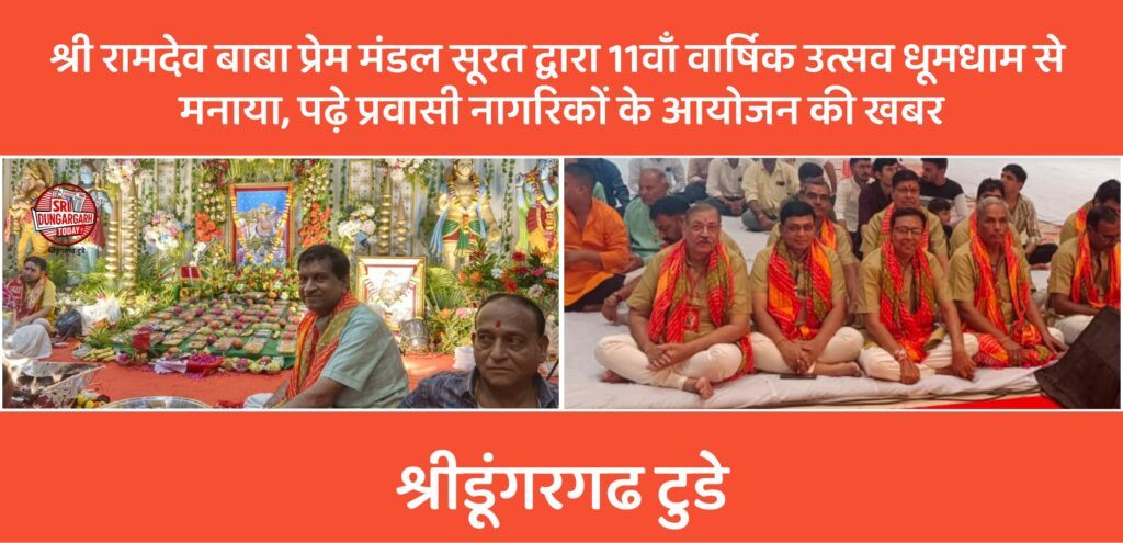 श्री रामदेव बाबा प्रेम मंडल सूरत द्वारा 11 वां वार्षिकोत्सव पर श्री रामदेव बाबा का विशाल भजन संध्या का आयोजन किया गया। आयोजन रविवार 10 अगस्त को सिटी लाइट स्थित माहेश्वरी भवन में दोपहर 2:15 से शुरू हुआ मंडल के प्रचार मंत्री कमल किशोर राठी ने बताया कि कार्यक्रम में बाबा रामदेव भक्त मंडल,मगरा क्षेत्र तथा हैदराबाद के भजन सम्राट सुशील बजाज ने बाबा के भजनों की शानदार प्रस्तुतियां दी। रंगारंग आयोजन में बाबा के भजनों ने सबका मन मोह लिया। श्रद्धालुओं ने खूब आनंद लिया सब बाबा के भजनों पर झूम उठे। पंडाल बाबा के जयकारों से गूंज उठा। इस दौरान बड़ी संख्या में सूरत सहित प्रवासी नागरिकों की भीड़ उमड़ी तथा आयोजन में करीब 2000 लोगो ने बाबा के महा प्रसाद का भोग लिया। महाप्रसाद बनाने मे अनिल मालानी, ओमप्रकाश चांडक, संतलाल करनानी का विशेष योगदान रहा। तथा महाप्रसाद वितरण व्यवस्था संभालने मे अनिल अग्रवाल ,सुरेन्द्र सुराणा,सूरज सादानी कोषाध्यक्ष गोपाल काबरा सहित कार्यकर्ताओं का बहुत सहयोग रहा। मंडल के सभी कार्यकर्ताओं ने सेवा भावना से सेवा की। मंडल के संरक्षक गोविन्द राठी तथा अध्यक्ष विनोद लाहोटी ने जानकारी देते हुए बताया कि मंडल सूरत के जरूरतमंद परिवारों को चिकित्सा सहायता में सहयोग प्रदान करता है।