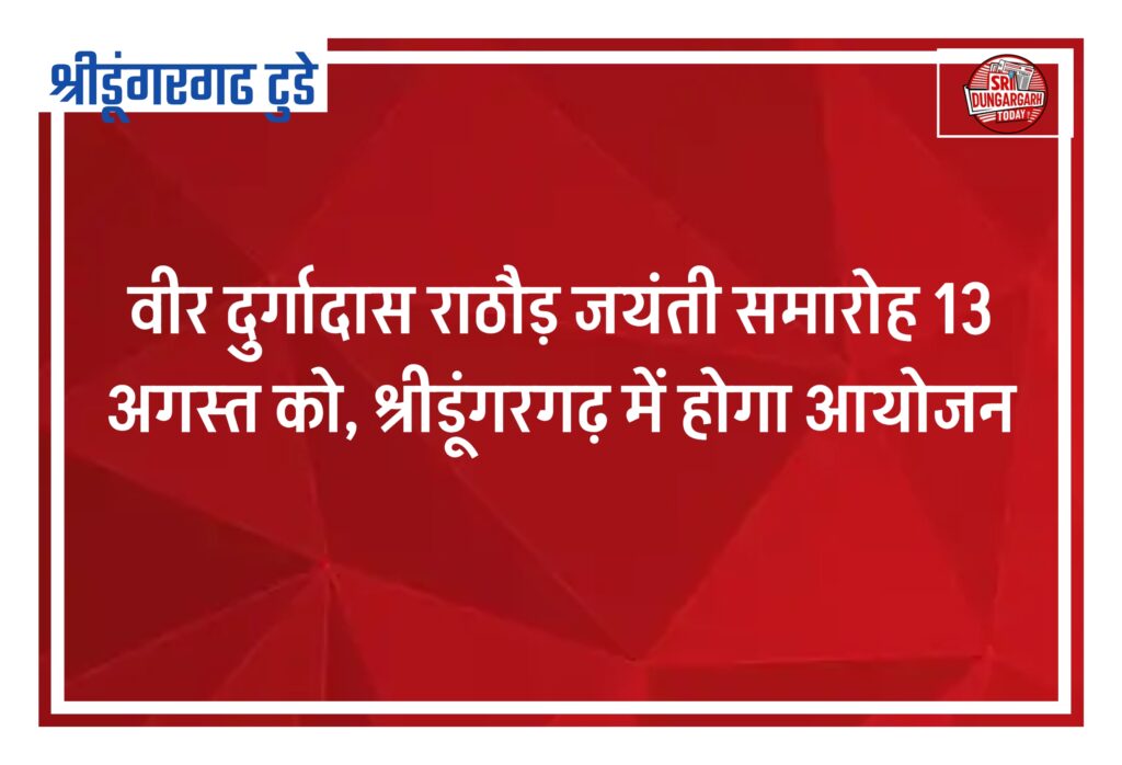 मारवाड़ के गौरव, राष्ट्रनायक और स्वाभिमान के प्रतीक वीर शिरोमणी दुर्गादास राठौड़ की जयंती पर श्री क्षत्रिय युवक संघ, प्रांत श्रीडूंगरगढ़, भव्य समारोह का आयोजन करने जा रहा है। यह कार्यक्रम 13 अगस्त, बुधवार को दोपहर 12 बजे से रघुकुल राजपूत छात्रावास, गैस गोदाम के पास, श्रीडूंगरगढ़ में आयोजित होगा। कार्यक्रम में संघ प्रमुख श्री लक्ष्मणसिंह बेण्याकाबास मुख्य अतिथि के रूप में और तारातरा मठ के महन्त प्रतापपुरी जी महाराज (विधायक पोकरण) परम सानिध्य प्रदान करेंगे। आयोजकों के अनुसार, इस अवसर पर वीर दुर्गादास राठौड़ के जीवन, उनके त्याग, शौर्य और क्षात्रधर्म के प्रति समर्पण को याद किया जाएगा। पूज्य श्री तनसिंह जी के निबंध ‘क्षिप्रा के तीर’ से भी प्रेरक प्रसंग साझा किए जाएंगे, जिनमें वीर दुर्गादास के बलिर और कर्तव्यनिष्ठा की झलक मिलती है।