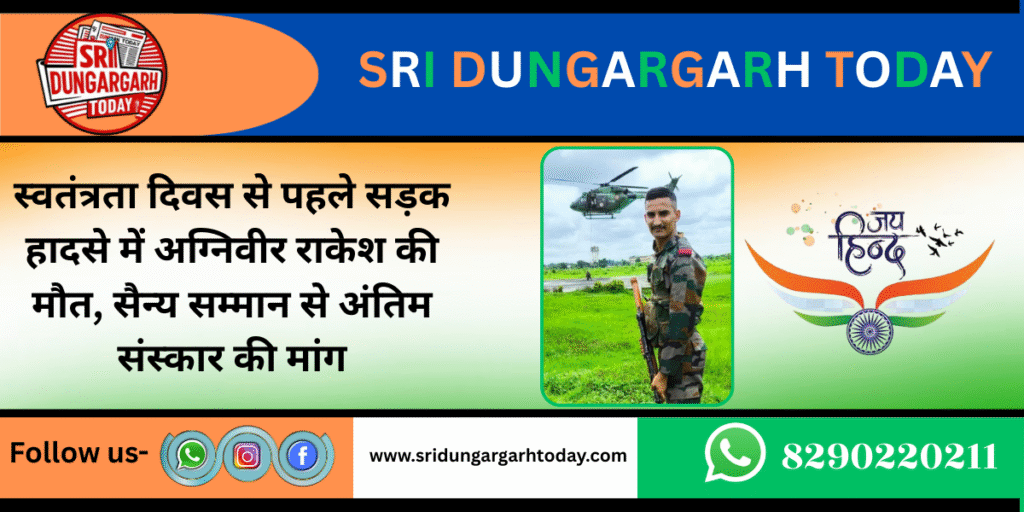 गांव लिखमीसर उत्तरादा के 23 वर्षीय अग्निवीर राकेश पुत्र किशनलाल जाखड़ की स्वतंत्रता दिवस की पूर्व संध्या पर सड़क हादसे में मौत हो गई। कश्मीर में तैनात राकेश गुरुवार शाम मोटरसाइकिल से भाभी के साथ गांव लौट रहे थे, जब ऊपनी-बाना के बीच एक तेज रफ्तार बस ने उनकी बाइक को टक्कर मार दी। गंभीर घायल राकेश ने अस्पताल पहुंचने से पहले दम तोड़ दिया। घटना के बाद पूर्व विधायक गिरधारीलाल महिया मौके पर पहुंच गए। वहीं गांव से अनेक युवा भी उपजिला अस्प्ताल पहुंच गए है। महिया ने जवान की मौत पर सेना से सैन्य सम्मान के साथ अंतिम संस्कार करने व शहीद का दर्जा देने की मांग की है। गांव के ओमप्रकाश भुंवाल ने बताया कि पूरा गांव सैन्य सम्मान के साथ अंतेष्टी की मांग कर रहा है। ग्रामीणों ने स्वतंत्रता दिवस के दिन शुक्रवार सुबह उपजिला अस्पताल के बाहर बैठकर मांग को मजबूत करने की बात कही है। वहीं शहीद सम्मान समिति के सीताराम सियाग ने इस सबन्ध में जिला सैन्य अधिकारी से बात कर सैन्य सम्मान से अंतिम संस्कार करवाने की मांग की है। तीन बहनों के इकलौते भाई राकेश की मौत से गांव में मातम छा गया है।