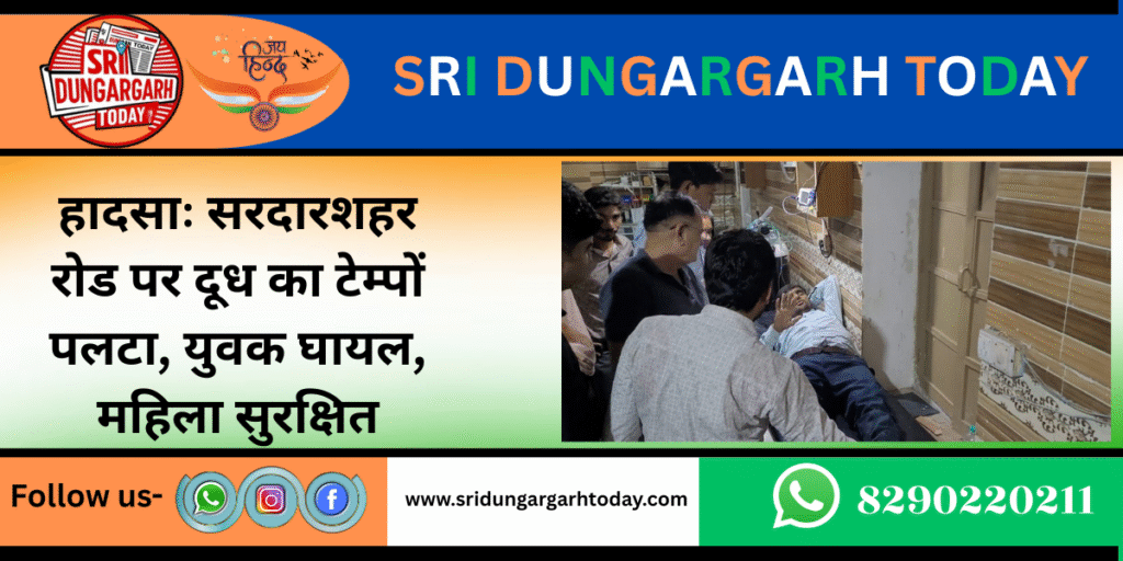श्री डूंगरगढ़ टुडे 15 अगस्त 2025 सरदारशहर रोड पर एक खुली बॉडी दूध का टेम्पों पलट गया। हादसा कांकड़ भैरूजी मंदिर के पास हुआ। टेम्पों में आगे दंपती सवार थे, जिसमें जेतासर निवासी 35 वर्षीय भंवरलाल पुत्र मामराज जाट घायल हो गया। वे जेतासर से श्रीडूंगरगढ़ आ रहे थे, तभी टेम्पों अनियंत्रित होकर पलट गया। सूचना मिलते ही ‘आपणों गांव श्रीडूंगरगढ़ सेवा समिति’ के सदस्य मौके पर पहुंचे और घायल को श्रीडूंगरगढ़ उपजिला अस्पताल लाया गया। डॉक्टरों के अनुसार भंवरलाल को मामूली चोटें आई हैं, जबकि साथ बैठी महिला पूरी तरह सुरक्षित है।
