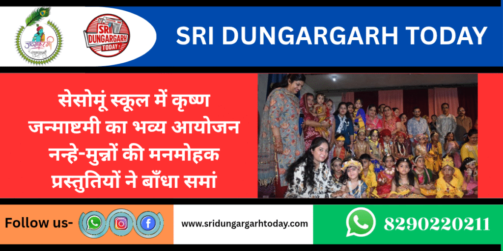 श्रीडूंगरगढ़। सेसोमूं स्कूल में आज कृष्ण जन्माष्टमी का महोत्सव बड़े उत्साह और श्रद्धा के साथ मनाया गया। इस अवसर पर स्कूल के चेयरमैन श्री जगदीश प्रसाद मूंधड़ा और वाइस चेयरपर्सन श्रीमती पद्मा मूंधड़ा की गरिमामयी उपस्थिति रही।