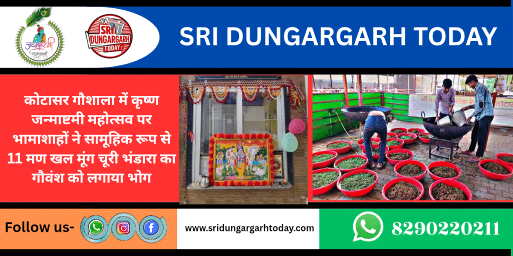 कृष्ण जन्माष्टमी के पावन अवसर पर गांव कोटासर की श्री करणी गौशाला में शनिवार को भामाशाहों ने सामूहिक रूप से विशाल भंडारा कर गौवंश को समर्पित किया। उड़ीसा प्रवासी मांगीलाल मूंधड़ा दुलचासर ने ₹ 6800 राशि समर्पित की,गंगा शहर निवासी राजेंद्र कुमार जोशी ने ₹1100रु, मुंबई प्रवासी रामेश्वर लाल सुथार दुलचासर ने ₹1100, बड़ोदरा प्रवासी सत्येंद्र प्रसाद गुप्ता बरेली ने₹1100 की राशि समर्पित करते हुए सामूहिक खल मूंग चूरी का भंडारा गौ माताओं को समर्पित कर जन्माष्टमी का पर्व मनाया वही गुवाहाटी प्रवासी शिवरतन सोमानी श्री डूंगरगढ़ ने गौ माताओं को गुड़ का भोग लगाया। गौशाला प्रबंधक ने बताया कि प्रतिवर्ष कृष्ण जन्माष्टमी पर विशाल गौ सेवा भंडारा होता है। गौशाला कमेटी ने गौशाला से जुड़े सभी दानदाताओं भामाशाहों ग्राम वासियों एवं देशवासियों को दी जन्माष्टमी की बधाई। गौशाला से जुड़े सभी गौ भक्तों के लिए सुख समृद्धि की कामना करते हुए आभार जताया।