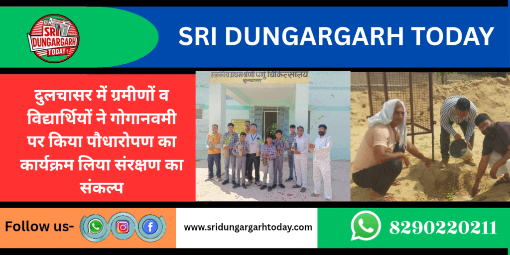 श्री गोपाल गौशाला दुलचासर एवं राजकीय प्रथम श्रेणी पशु चिकित्सालय दुलचासर में गोगा नवमी के पावन अवसर पर एक पेड़ मां के नाम व हरियालो राजस्थान अभियान के तहत पौधारोपण का आयोजन किया गया। गोशाला सचिव रेवन्त सिंह पड़िहार ने बताया कि राजकीय प्रथम श्रेणी पशु चिकित्सालय के चिकित्सक सुभाष घारू एवं स्टाफ मनोज कुमार,राजकुमार दिलधारणियां,राजकीय औषधालय के चिकित्सक जगदीश प्रसाद, पत्रकार रामकिशन, सोहनलाल महिया, बालूराम महिया एंव विद्यार्थी व ग्रामीणों ने एकजुट होकर सभी ने एक-एक वृक्षारोपण कर पर्यावरण संरक्षण का संदेश दिया। तथा सभी मे वृक्षों का रख रखाव करने का संकल्प लिया।