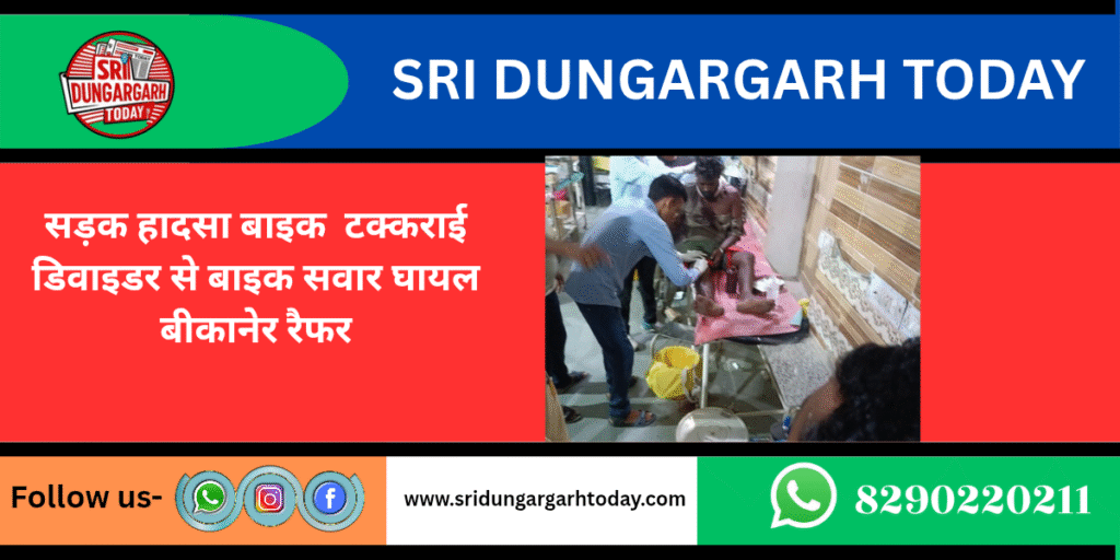 अभी कुछ देर पहले नेशनल हाइवे पर कितसार के पास एक मोटर साईकिल अनियंत्रण होकर डिवाइडर में टक्करा गई। जिसमे बाइक सवार विजय कुमार पुत्र पूनमचंद वाल्मीकि 25 वर्ष निवासी श्रीडूंगरगढ़ मोमासर बास गंभीर घायल हो गए सूचना मिलती है डॉक्टर एपीजे अब्दुल कलाम वेलफेयर सोसाइटी के सेवादार मौके पर पहुंचे और घायल को उपजिला अस्पताल पहुंचाया जंहा प्राथमिक उपचार के बाद बीकानेर रैफर कर दिया।