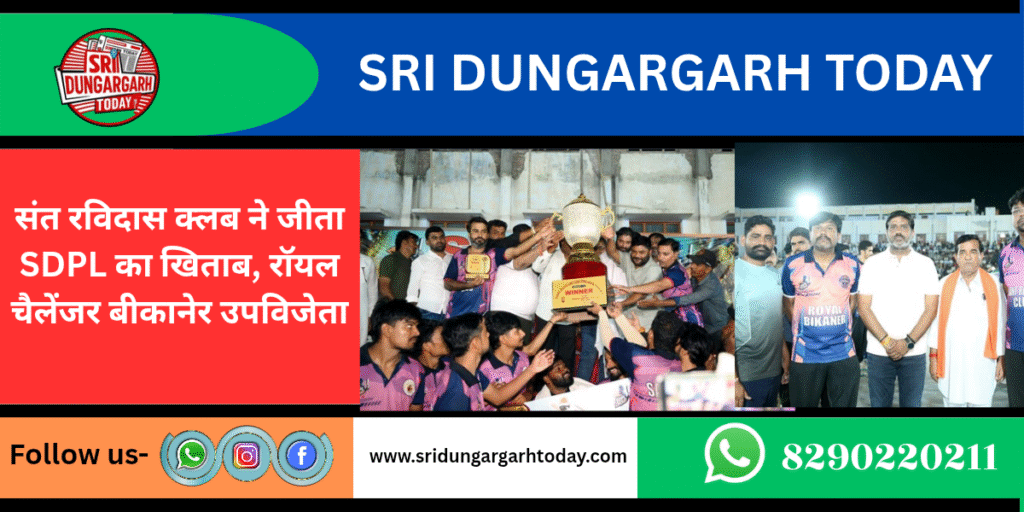 श्रीडूंगरगढ़ प्रीमियर लीग (SDPL) का समापन मंगलवार देर रात हुआ। फाइनल मुकाबले में संत रविदास क्लब ने शानदार खेलते हुए विजेता ट्रॉफी अपने नाम की रॉयल चैलेंजर बीकानेर उपविजेता रही है। समारोह में नगर पालिका अध्यक्ष मानमल शर्मा,पार्षद भरत सुथार,बाबा सिकंदर श्योराण राजू चौपदार, श्रीचंद जोशी, अनिल जोशी, बृजलाल तावनियां, कमल गरनानी ,जाकिर चौपदार शुभकरण उपाध्याय,दीनदयाल माली, मैक्स सुथार सहित SDPL आयोजन कमेटी के सदस्य उपस्थित रहे। बाबा सिकंदर श्योराण ने विजेता और उपविजेता को पुरस्कार वितरण किया इस दौरान उन्होंने खिलाड़ियों को खेल भावना का संदेश देते हुए दोनों टीमों को शानदार खेल प्रदर्शन दिखाने का धन्यवाद ज्ञापित किया। आयोजन समिति ने बाबा सिकंदर श्योराण को शानदार सहयोग करने पर उनका धन्यवाद किया