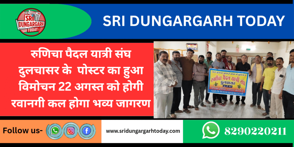 रुणिचा पैदल यात्री संघ दुलचासर के अध्यक्ष संदीप कुमार मूंधड़ा दुलचासर एवं संघ संरक्षक मूलचंद मूंधड़ा द्वारा बाबा के भक्तों की मौजूदगी में पोस्टर का विमोचन हुआ संघ अध्यक्ष संदीप कुमार मूंधड़ा ने बताया कि 22 अगस्त को सुबह 6:00 बजे बाबा रामदेव जी के मंदिर से दिव्य ज्योत प्रचलित कर ढोल नगाड़ों के साथ धूमधाम से रवाना होगा रुणिचा पैदल यात्री संघ दुलचासर की यह 30 वीं फेरी होगी। कल 21 अगस्त को सायंकाल 6 बजे से रात्री 12बजे तक बाबा के भव्य जागरण का आयोजन होगा बाबा रामदेव मित्र मंडल मगरा क्षेत्र अपने भजनों की प्रस्तुतियां देंगे। संघ के पदाधिकारी आयोजन को लेकर तैयारियों में जुटे हुए है।