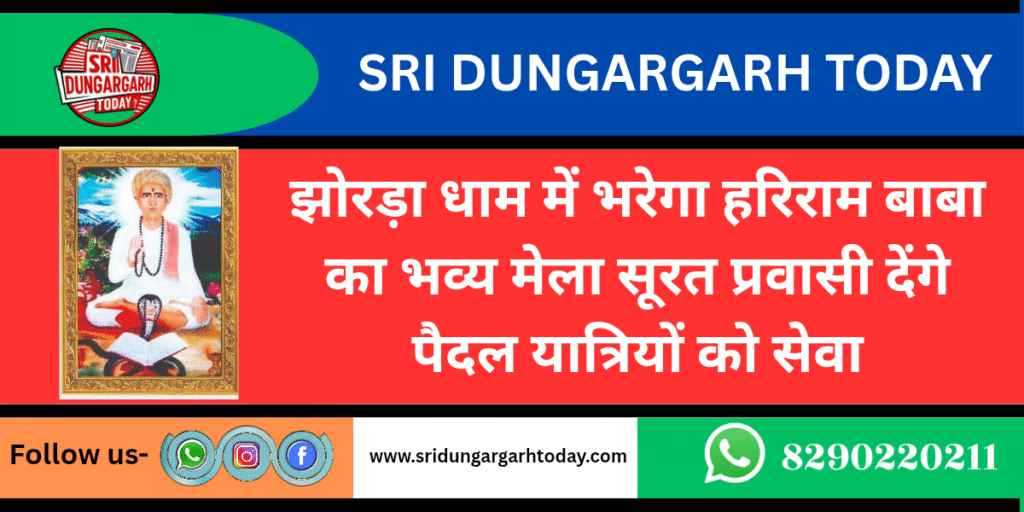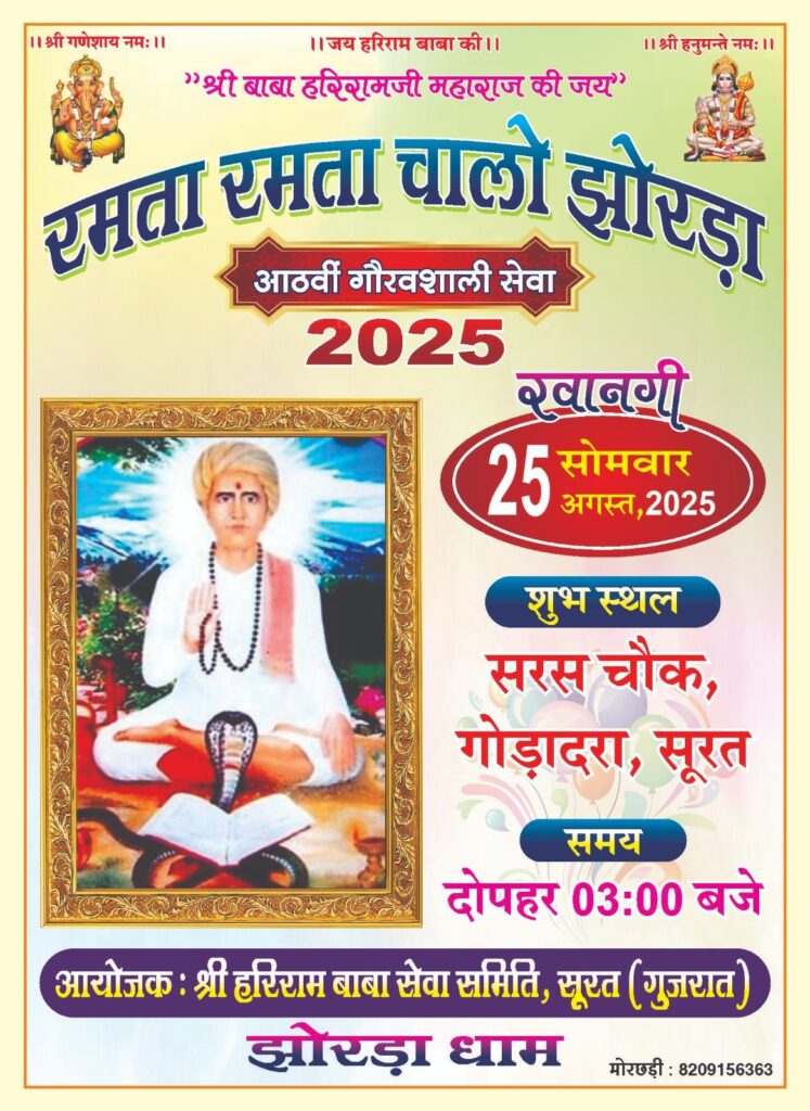 भादवा सुदी पंचमी, 28 अगस्त 2025, गुरुवार को झोरड़ा धाम में कलयुग अवतारी हरिराम बाबा का वार्षिक मेला भरेगा। मेले में दूर-दराज से हजारों की संख्या में श्रद्धालु पहुंचकर बाबा के दर्शन करेंगे। सूरत में रहने वाले श्रीडूंगरगढ़ प्रवासियों द्वारा संचालित श्री हरिराम बाबा सेवा समिति, सूरत इस बार भी अपनी परंपरा को आगे बढ़ाते हुए मेले में आने वाले पैदल यात्रियों को सेवाएं देंगे यह लगातार आठवां वर्ष होगा जब समिति यात्रियों की सेवा में जुटेगी। मदन सारस्वत ने बताया कि समिति द्वारा 26 अगस्त से 28 अगस्त 2025 तक झोरड़ा में भव्य सेवा शिविर लगाया जाएगा। इस इस दौरान 25 अगस्त को सूरत से समिति के सदस्य झोरडा पहुंचेंगे और अगले तीन दिन तक बाबा के भक्तों के लिए सेवाए देंगे इस दौरान यात्रियों के लिए सेवा व्यवस्थाएं ठंडे पानी की व्यवस्था, बूंदी व पकोड़ी का नाश्ता, चाय-कॉफी, फल, बिस्किट एवं वेफर और मेडिकल सुविधा भी उपलब्ध होगी इसके साथ ही यात्रियों के आराम हेतु विशेष व्यवस्था भी होगी। मेले में पहुंचने वाले श्रद्धालुओं को यह सेवा समिति पूरी श्रद्धा और उत्साह के साथ उपलब्ध करवाएगी।