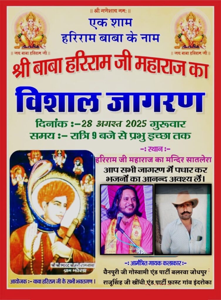 सातलेरा गांव में हरिराम जी महाराज एवं भैरूं जी महाराज का विशाल जागरण 28 को तैयारियां चल रही जोरो पर,आज होगी सुपरफास्ट मंडल पैदल यात्री संघ की रवानगी