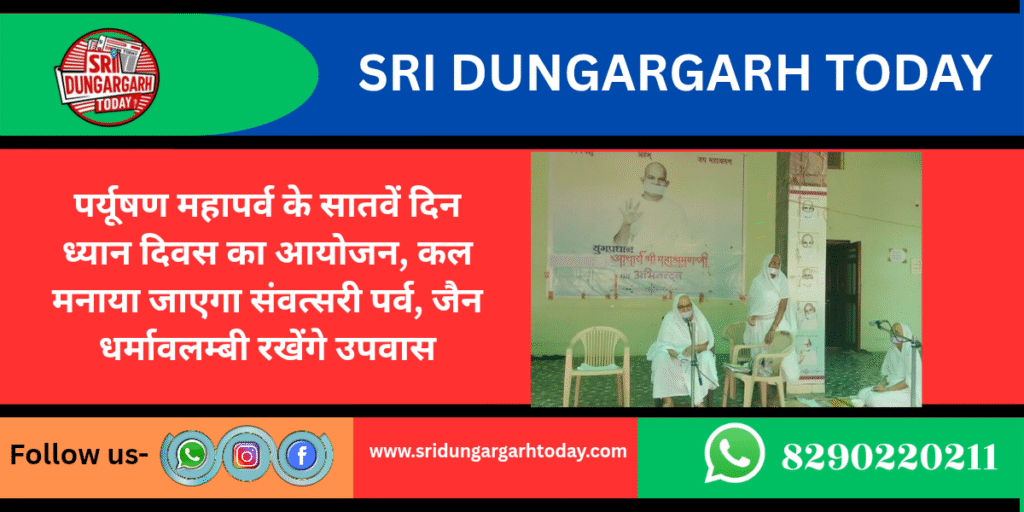 पर्यूषण महापर्व के सातवें दिन मंगलवार को श्रीडूंगरगढ़ सेवा केंद्र मालू भवन में ध्यान दिवस मनाया गया। इस अवसर पर सेवा केंद्र व्यवस्थापिका साध्वी संगीतश्री और डॉ. साध्वी परमप्रभा की पावन सन्निधि रही। कार्यक्रम की शुरुआत प्रवचन के साथ सामूहिक ध्यान प्रयोग से हुई, जिसमें श्वास प्रेक्षा, ध्यान का अभ्यास कराया गया। साध्वी ने भगवान महावीर के पूर्व जन्मों का सहज और सरल वर्णन करते हुए ध्यान की महत्ता बताई। उन्होंने कहा कि ध्यान से आत्मशुद्धि एवं अंतर्मन की शांति प्राप्त होती है। इस अवसर पर साध्वी ने ध्यान दिवस की कई सत्य घटनाओं का उल्लेख कर उपस्थित श्रद्धालुओं को आत्मानुशासन और साधना के मार्ग पर चलने की प्रेरणा दी।अंत में साध्वी ने आगामी संवत्सरी महापर्व पर अधिक से अधिक उपवास एवं पौषध करने का संदेश देते हुए कहा कि संवत्सरी क्षमापर्व आत्मशुद्धि का महान अवसर है और प्रत्येक व्यक्ति को इसका लाभ लेना चाहिए।